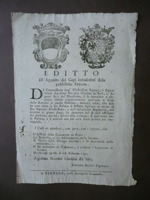 Vedere la descrizione dettagliata Grida Editto di Appalto dei Capi infrascritti delle Pubbliche Entrate" Ferrara, Stamperia Camerale, 1750, cm. 22x31,5, carta filigranata. Condizioni di conservazione Esemplare in buono stato, scritta riassuntiva d'epoca al retro, piccole macchiette d'inchiostro,un msrgine leggermente rifilato. Bella grida con doppio stemma xilografico. Appalto per "l'Assunamento delle Strazze"; "Il Vuoto della Pescaria Vecchia"; "Ius Privativo di Fabricare e vendere l'Acquavita di Ariano". Per altri volumi e documenti su questo e altri argomenti visitate il nostro negozio "Libreria Grandangolo" CONDIZIONI DI VENDITA Spedizione Fino a 5 kg piego di libri raccomandato, oltre i 5 kg pacco postale. Si ricorda che l'imballo viene eseguito con la massima cura. La merce viene spedita a pagamento avvenuto e viaggia a rischio e pericolo dell'acquirente. Per maggiori informazioni vedi la pagina SPEDIZIONI del nostro negozio. Ritiro diretto Siamo disponibili per il ritiro diretto a Modena e a Milano. Per gli indirizzi delle sedi vedi la pagina DOVE SIAMO del nostro negozio. Acquisti multipli Se si acquistano più libri, la spedizione si paga una sola volta, purché si rispettino gli scaglioni di peso. Estero / Foreign For international shipment, please contact us. Metodo di pagamento Pay Pal, bonifico bancario, versamento postale (cc/p, vaglia o altro). La spedizione avverrà entro i primi 4 giorni lavorativi dopo la conferma di avvenuto pagamento. Si emette ricevuta fiscale e a richiesta fattura. Il pagamento deve essere effettuato entro 7 giorni lavorativi dalla data di acquisto, trascorsi i quali l'oggetto sarà rimesso in vendita. Feedback Viene rilasciato dall'acquirente dopo il ricevimento di quanto acquistato. Data la sua importanza, vi invitiamo a leggere il breve testo della pagina FEEDBACK del nostro negozio. Pertanto, in caso di qualsiasi problema, non esitate a contattarci. Diritto di recesso L'acquirente ha il diritto di restituire l'oggetto entro 14 giorni ed essere rimborsato, escluse le spese di porto e imballo. L'oggetto deve essere restituito, dopo previa comunicazione, imballato e nelle medesime condizioni di come era all'origine. Creato da Turbo Lister Strumento gratuito per mettere in vendita i tuoi oggetti. Metti in vendita i tuoi oggetti in modo facile e veloce e gestisci le inserzioni in corso. "