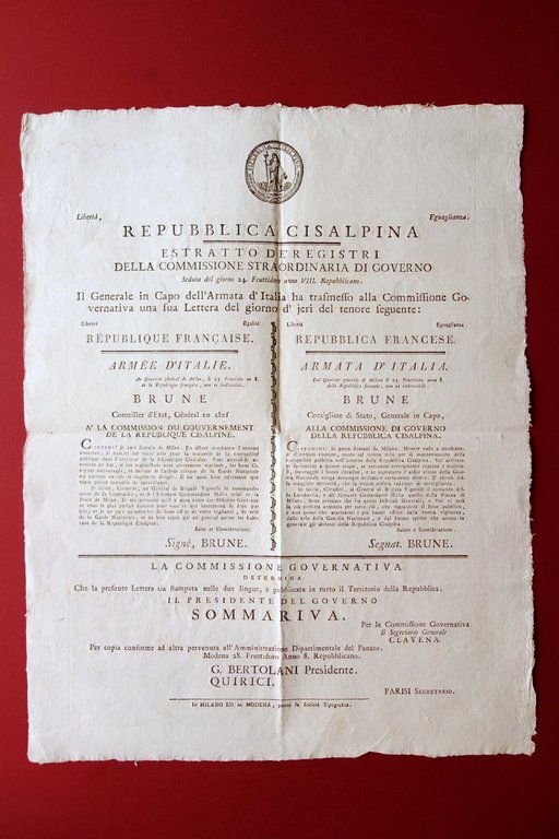 Grida Repubblica Cisalpina Armata d'Italia Ordine Pubblico Lombardia Milano 1800