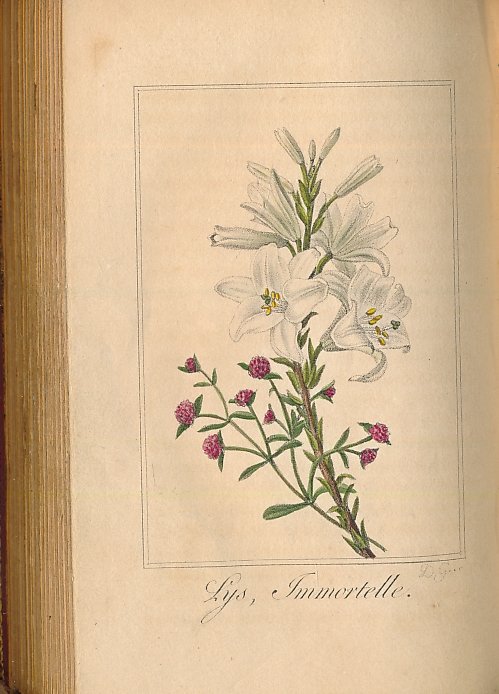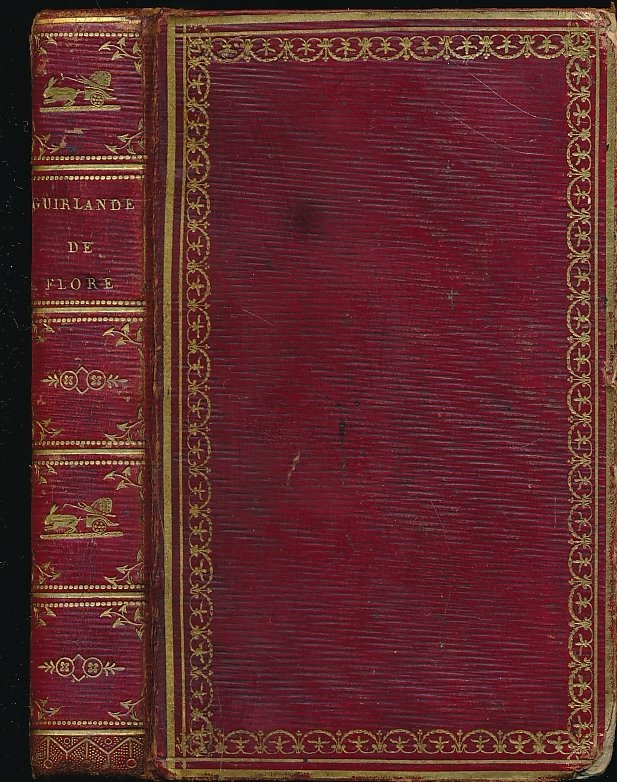 Chez Janet 1815 A Paris, Chez Janet, 1815. In-16 relié plein maroquin rouge. Dos lisse orné de motifs spéciaux dorés. Roulette et double filet doré sur les plats et les coupes, roulette intérieure. XXXVI + 180 pages + calendrier pour l'An 1815. 15 planches hors texte de fleurs coloriées et réhaussées. Légères rousseurs. Coins émoussés, sinon bon état