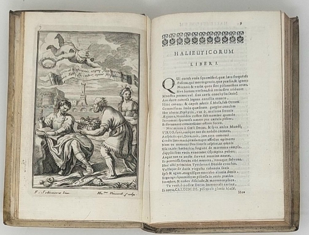 >in-12 (154x100 mm), pp. 245, (3), bel carattere tondo minuto, legatura coeva in pergamena rigida, tagli screziati. Antiporta raffig. Apollo e le Muse, altra tavola allegorica con ritratto dell'autore, 10 stupende tavole f.t. disegnate da Francesco Solimena ed incise in rame da François de Louvemont e da Uberto Vincent. Bella edizione e prima tiratura delle incisioni. Poema in dieci canti celebrativo della pesca in mare con la lenza, la nassa, la rete ed altri mezzi. Nicola Giannettasio (Napoli 1648-1715) fu dotto letterato latinista, matematico e filosofo, dal 1666 padre gesuita. Fu autore di vari poemi in lingua latina. Esemplare bellissimo dell'Halieutica, delizioso e raro libro illustrato, assai fresco. Fera-Morlicchio n.1742 ''Rarissimo''. Ceresoli, p.281. Vinciana n.3108. BM XVIII sec. I, 394.