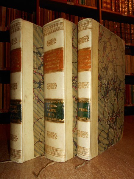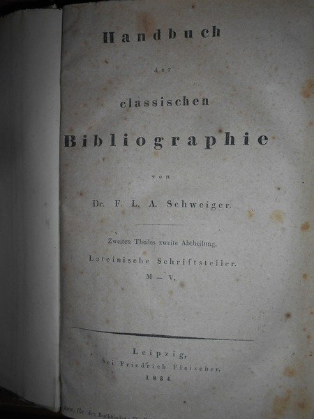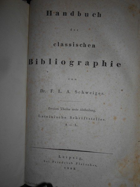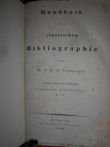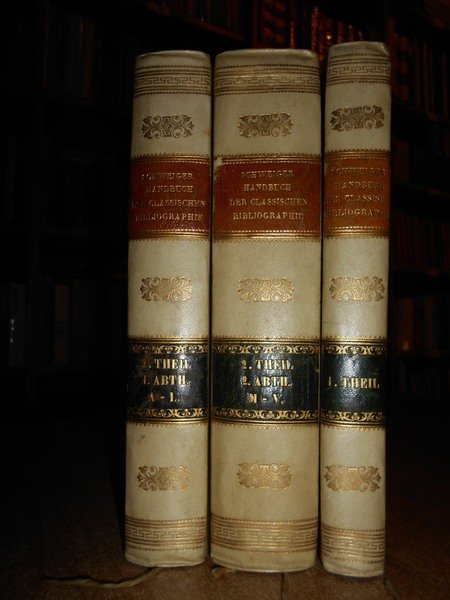 von F.L.A. Schweiger. Erster Theil Griechische Schriftsteller. Leipzig, bei Friedrich Fleischer, 1830 - 1832 - 1834. Handbuch der Calassischen BIBLIOGRAPHIE. 3 volumi in-8°, m. pergamena con angoli, dorsi con fregi e titoli in oro. I. (viii), 364 pp. - pp. 361-362 were never published. In its place there is an unnumbered leaf which should be appended to be preface. II. xii, 584 pp. III. Pp. (ii), 585-1350. Collated. Ottimo esemplare. Uff. E - II - 3