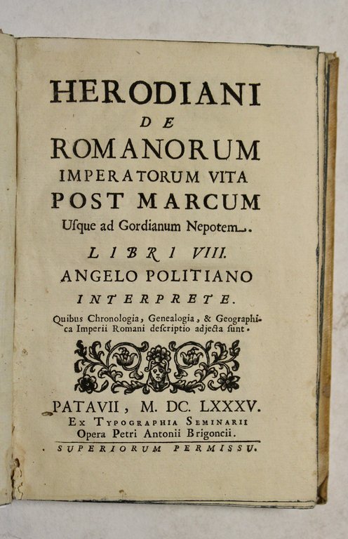 Herodiani de romanorum imperatorum vita post Marcum Usque ad Gordianum Nepotem. Libri VIII. Angelo Politiano interprete. Quibus Chronologia, Genealogia, & Geographica Imperii Romani descriptio adjectasunt, [fregio tipogr.]