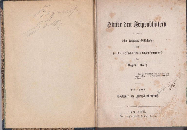 Hinter den Feigenblättern. Eine Umgangs-Philosophie und pathologische Menschenkenntniß. (Signiert!) Band 1-3 (in 1 Band).
