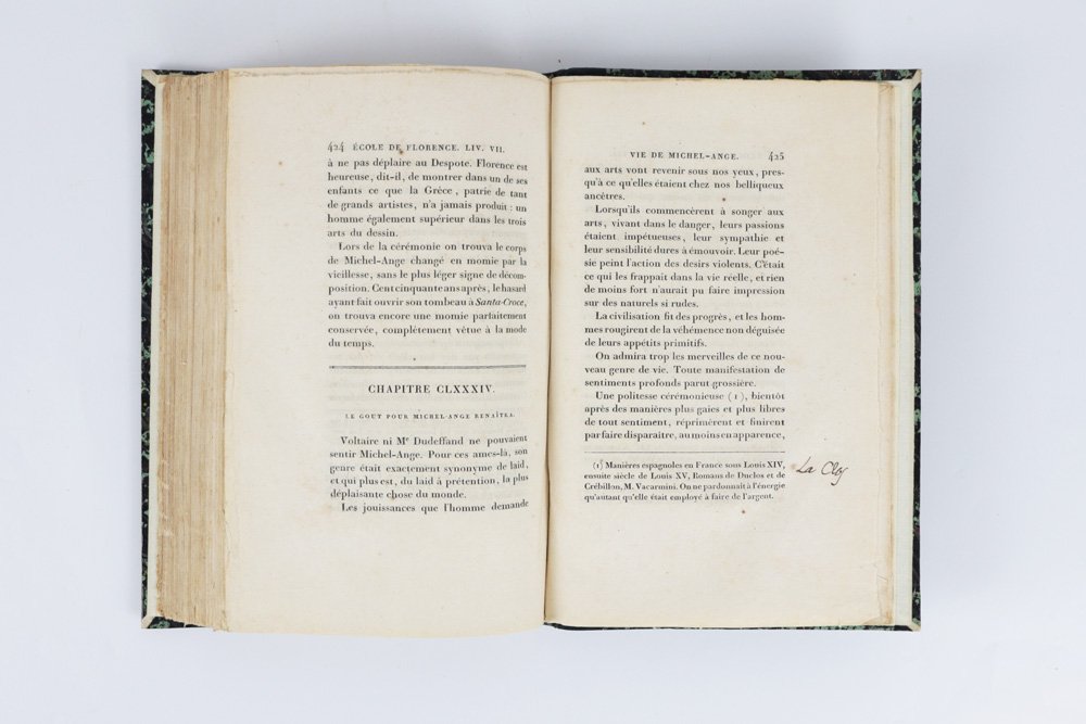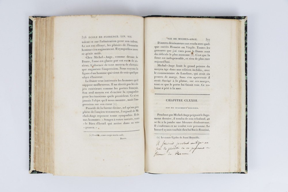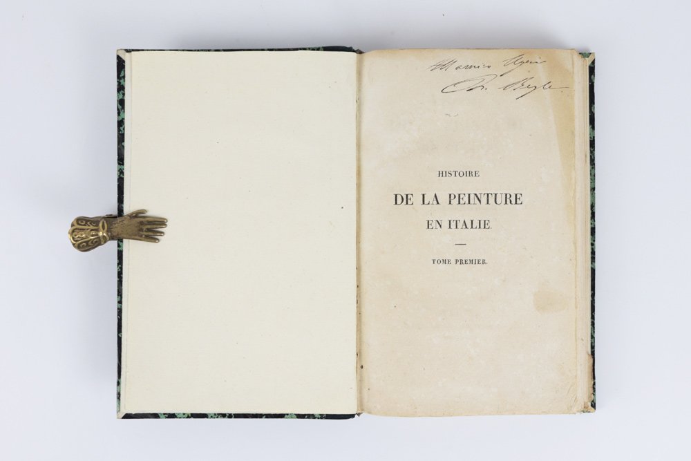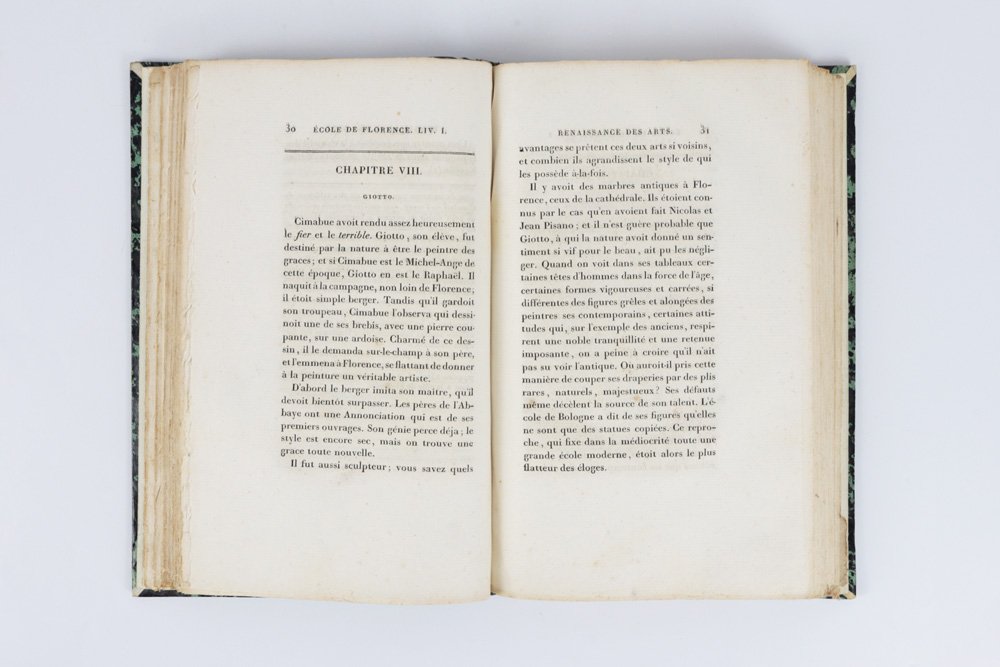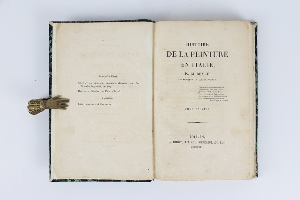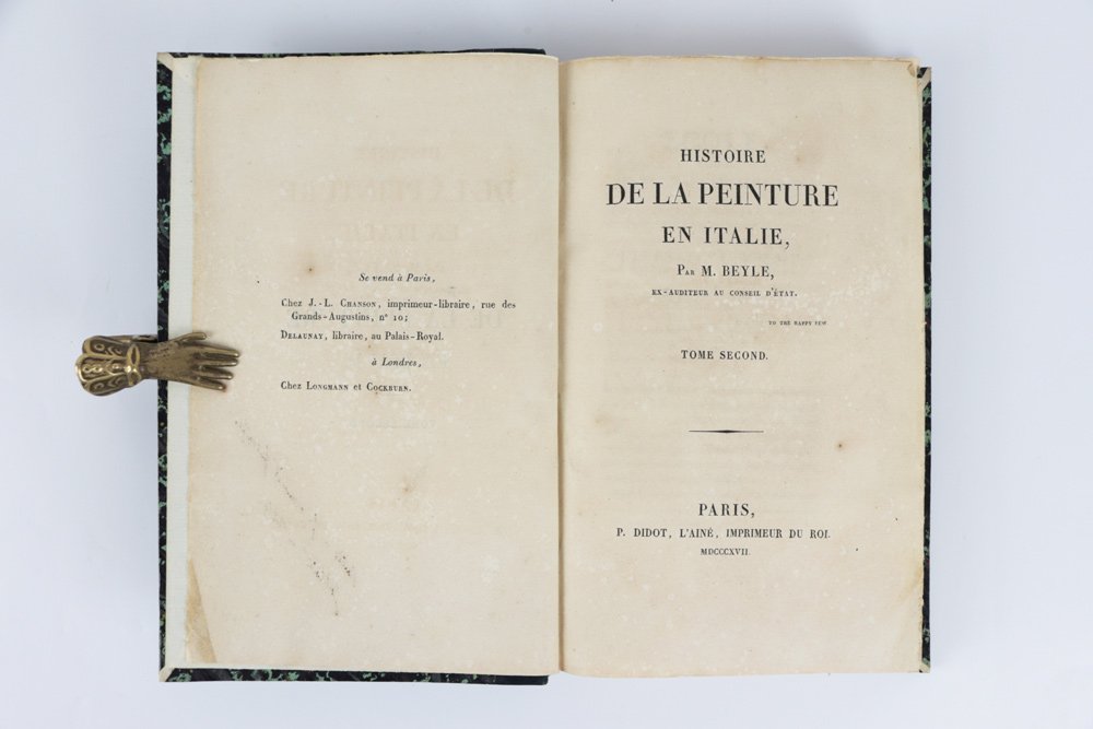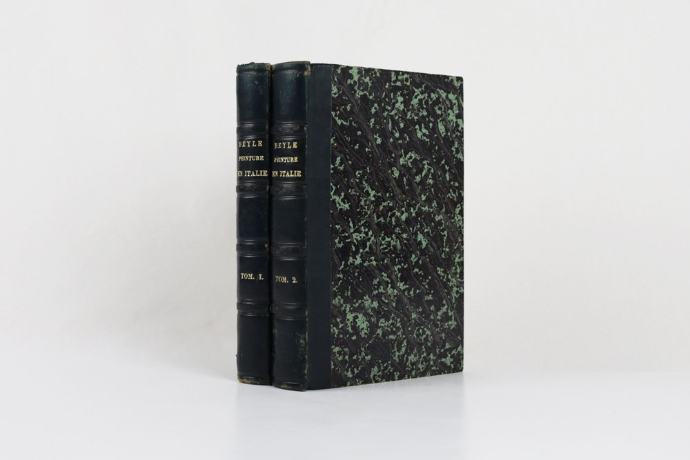 - sobria legatura dell’epoca in mezza pelle verde smeraldo, al dorso quattro nervetti appena lavorati a secco, autore-titolo in oro nel secondo quadrante («Beyle | Peinture.»), numero di tomo nel quarto, piatti in carta marmorizzata in tono, cuffie in seta verde e oro, fogli di guardia in carta bianca;