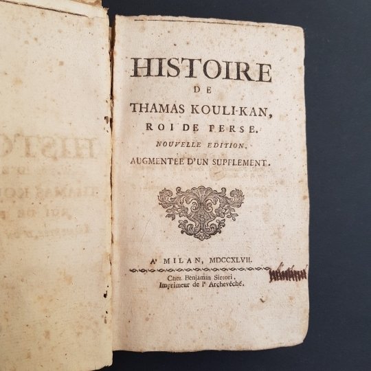 In-8°, pp. (4), 267 + 40 di 'Supplement', cartonatura in carta decorata dell'epoca, titolo manoscritto su tassello cartaceo al dorso. Lievi bruniture, abrasioni alla legatura. Riedizione, accresciuta di un supplemento, di quest'anonima opera di storia, geografia ed etnografia della Persia e dell'Asia Centrale, oggetto principale della trattazione è Thamas Kouli Kan, o Nadir Shah (1688-1747), uno dei massimi sovrani persiani, ma il lavoro, fondato sulle memorie storiche del Krusinski, contiene una quantità di notazioni sulla storia, la topografia, le religioni e i costumi della Persia e dell'Afghanistan (profusi cenni sono riservati a Kabul e a Ladak).
