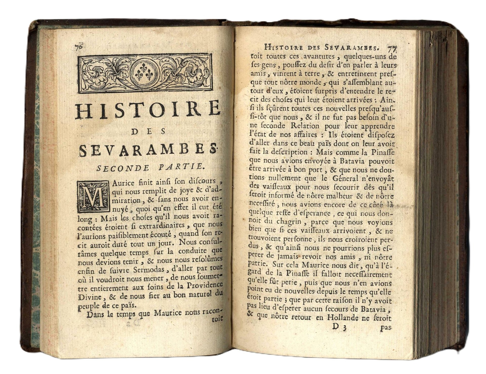 >2 volumi in 1 tomo in-8, (mm 155x87), pp. (18), 273; 247. Legatura coeva in piena pelle marezzata, titolo oro su tassello e ricchi fregi al dorso ( mancanze alla cuffia superiore ed agli angoli), belle iniziali xilografiche, tagli spruzzati. Il testo, scritto in linguaggio barocco, narra la storia dei Sevarambi, un popolo immaginario che vive in una terra sconosciuta e inaccessibile. Il racconto è diviso in tre parti: la prima descrive l'origine e le caratteristiche della popolazioni dei Sevarambi, la seconda le leggi e la loro organizzazione sociale, la terza è dedicata alla religione ed ai loro usi e costumi. Il popolo vive sotto un regime ideale, "eliocratico": non conosce né diritti ereditari, né proprietà privata. La verosimiglianza del racconto è ottenuta con il ricorso a racconti di viaggio reali, come quelli di Pelsart, Tavernier e Garcilaso de la Vega. La Storia dei Sévarambes (1677-79) di Denis Veiras è la prima utopia moderna, che presenta una società di uomini, imperfetti, corruttibili, ma che, guidati dalla sola ragione, riescono a fondare una nazione basata sui principi di giustizia e tolleranza. In contrapposizione ai governi europei del XVII e XVIII secolo, quello immaginato da Veiras è stabile, benevolo e fondato su una sorta di meritocrazia. La religione civile, deista se non materialista, lascia all'individuo una perfetta libertà di coscienza. "Nel corso del XVII e del XVIII secolo decine di opere ripresero il paradigma del viaggio immaginario e diedero rappresentazioni assai contrastanti della Città felice (tra le più importanti: La Città del Sole, 1623, di Tommaso Campanella; la New Atlantis, 1627, di Francis Bacon; L'île de l'Ajao, 1768, di Bernard de Fontenelle)". Denis Vairasse (1635-1700) esiliato a Londra per sfuggire alle persecuzioni religiose nel continente, pubblicò la prima edizione in cinque parti, contemporaneamente in inglese e francese, tra il 1675 e il 1679. Il libro venne tradotto in diverse lingue e fu più volte pubblicato fino al XVIII secolo. Esemplare discreto: un po' corto di margini, qualche piccola macchietta scura e due piccole bruciature (p.169). Barbier, 7959. Brunet, 17324. Monfort, Storia dell'utopia, p. 271.