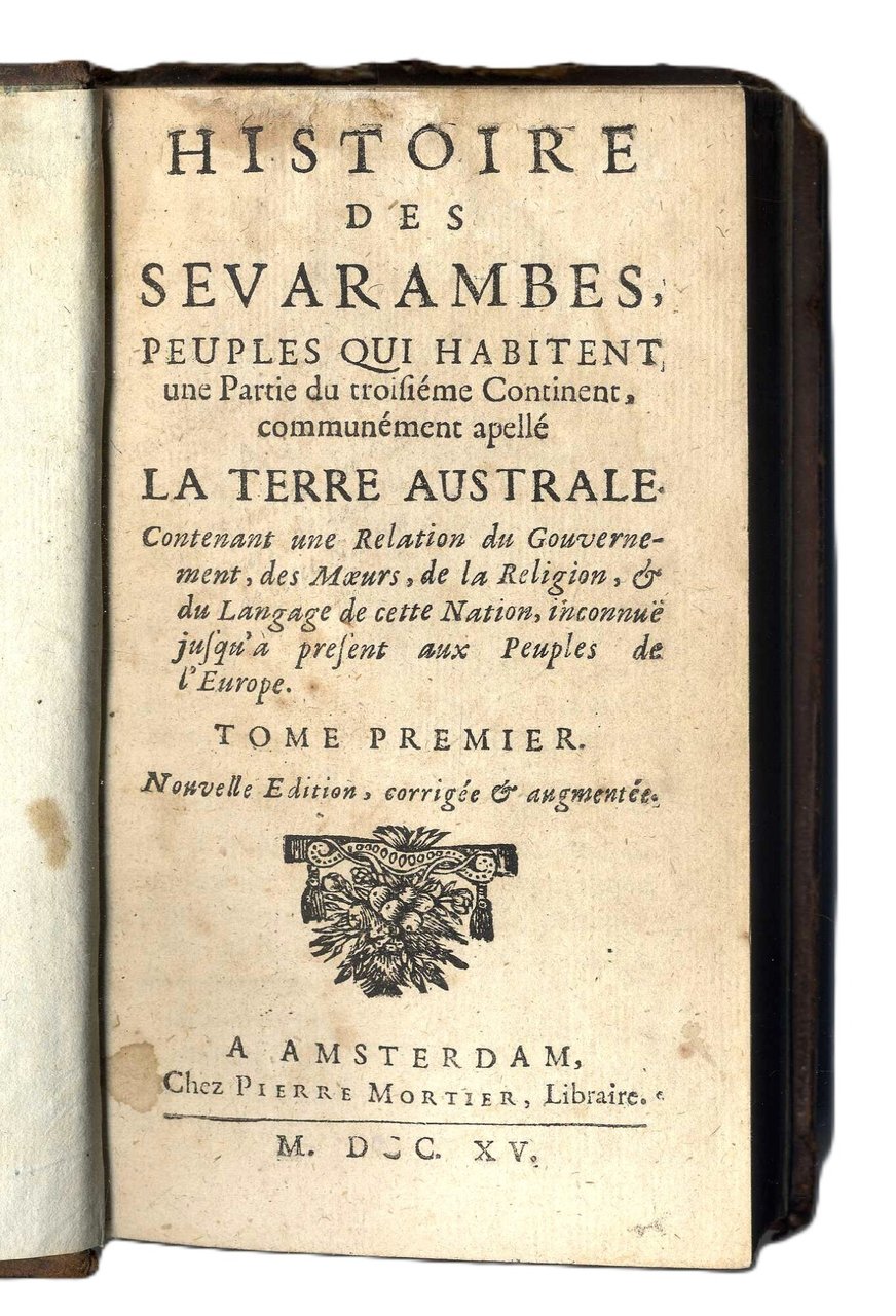Histoire des Sevarambes peuples qui habitent une partie du troisiéme Continent, communément apellé La terre Australe. Contenant une Relation du Gouvernement, des Moeurs, de la Religion, et du Langage de cette Nation, inconnue jusqu'à present aux Peuples de l'Europe. Nouvelle edition, corrigée et augmentée.