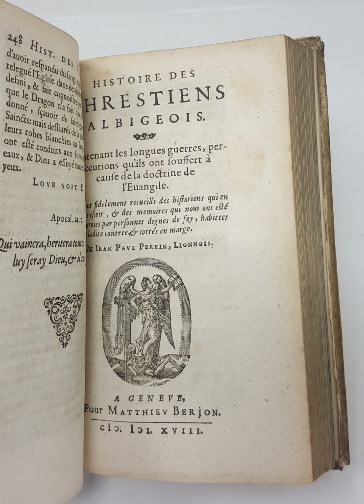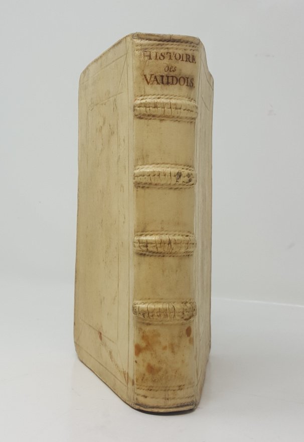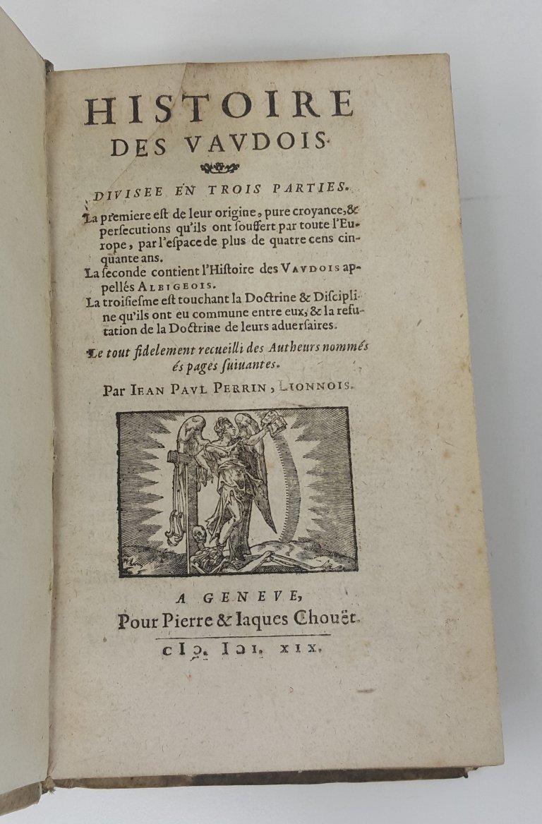 >3 parti in 2 tomi, in 1 vol. in-8 (175x105 mm), pp. (32), 248; (8), 333; legatura coeva in pergamena rigida decorata a secco, titolo manoscritto su dorso a 4 nervi. Impresa dello stampatore sui due titoli, fregi tipogr. e iniziali ornate. La seconda e terza parte sono contenute nel tomo secondo. Prima edizione, ed unica, di quest'opera eccezionalmete importante e rara, che costituisce la prima storia del popolo valdese mai pubblicata. La terza parte (pp.253-331) è scritta in lingua provenzale, con testo francese a lato. Perrin (storico e Ministro protestante francese, nato a Lione verso il 1580) lavorò per oltre cinque anni alla compilazione dell'opera, consultando un'enorme mole di documenti fornitigli dai pastori valdesi di tutte le valli e quelli messi a sua disposizione dai sinodi di Embrun, Grenoble, S.Marcelin e altri. Il primo tomo è dedicato a Monseigneur François de Bonne; il secondo a Henri de Foix. L'opera, anche se indirettamente, riguarda la montagna, in quanto vari capitoli si occupano dell'arrivo dei Valdesi nelle montagne e valli del Piemonte, in particolare nelle "vallées Maties et Meane, Marquisat de Saluces, Luserne et Perouse", in valli che ancor oggi si definiscono Valdesi. Esemplare assai bello, genuino e marginoso, perfettamente conservato. Non in Perret, e non in Manno-Promis. Caillet, 8539: «Rare...ouvrage remarquable...On trouve dans cette étude des fragments précieux des anciens traités vaudois». Brunet IV, 513 (con evidente errore di data) e Supplement, II, 209 (con data esatta).