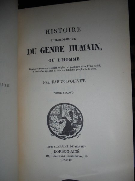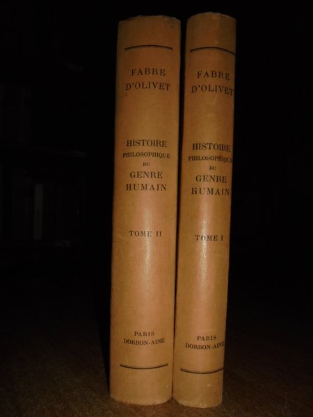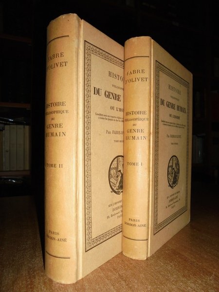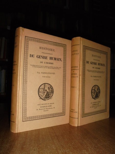 Fabre-D' Olivet. Paris, Dorbon-Ainé (s.d.). Histoire Philosophique du Genre Huamain ou l' Homme considéré sou ses rapports religieux et politiques dans l' état social à toutes les époques et chez les différentes peuples de la Terre. Sur l' imprimé de 1822 - 1824. 2 volumi in-8°, cartonato. xv, 348 pp.; 469 pp. Ottimo esemplare. Neg. mens. bianca cassa.