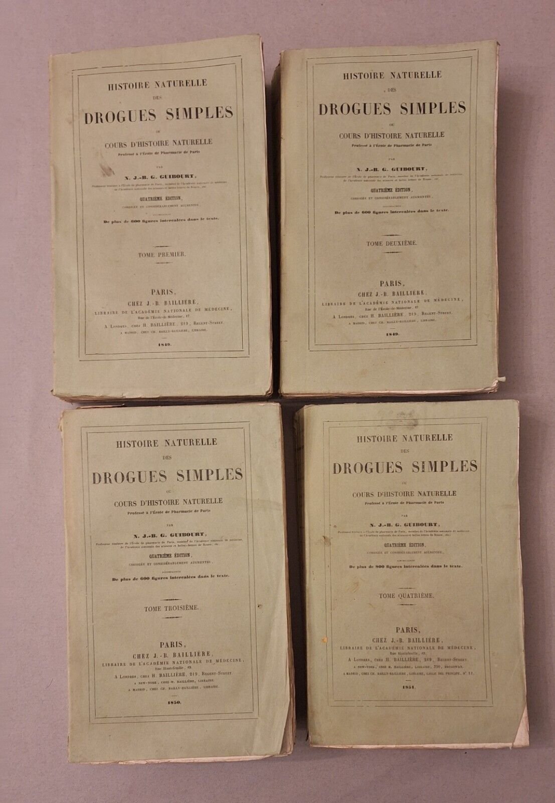 HISTOIRES NATURELLE DES DROGUES SIMPLES PAR GUIBOURT BAILLIERE 1849In 8°, 4 volumi, legatura editoriale, copertina cartacea, ill. in b/n.Il terzo volume ha un taglio al dorso, lievi segni del tempo agli altri.