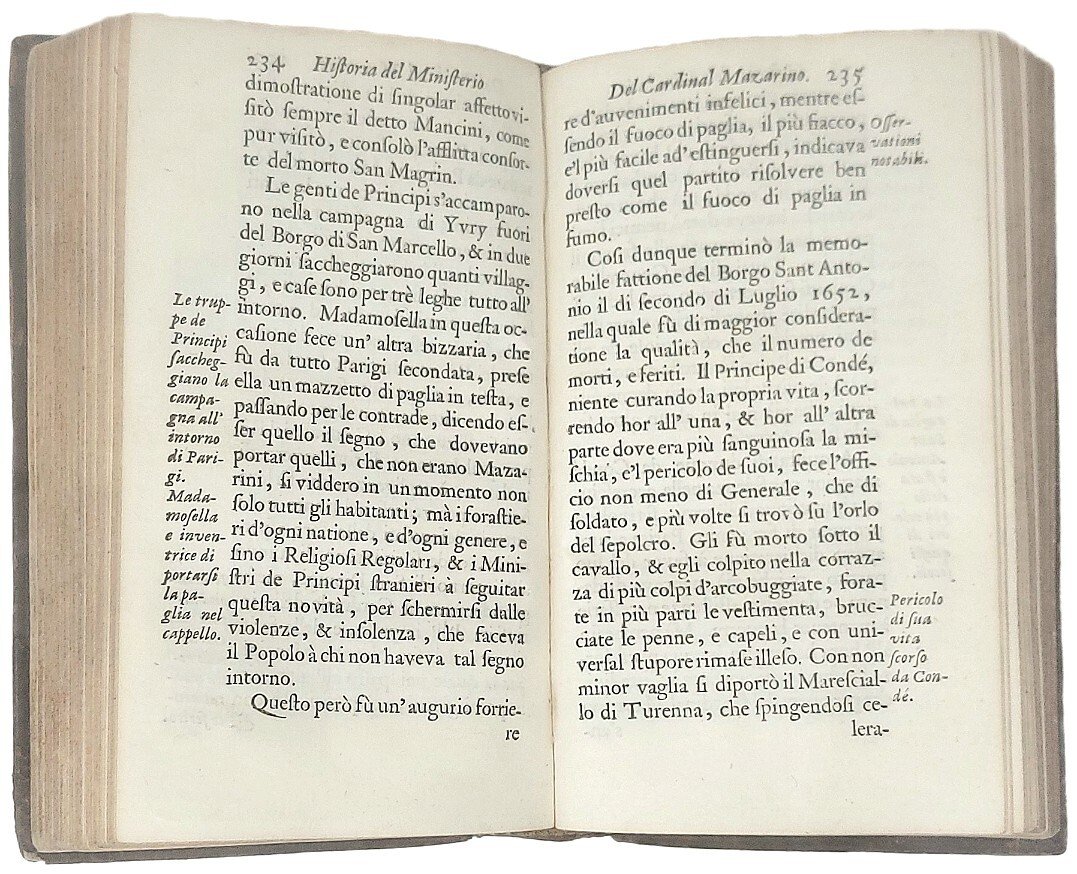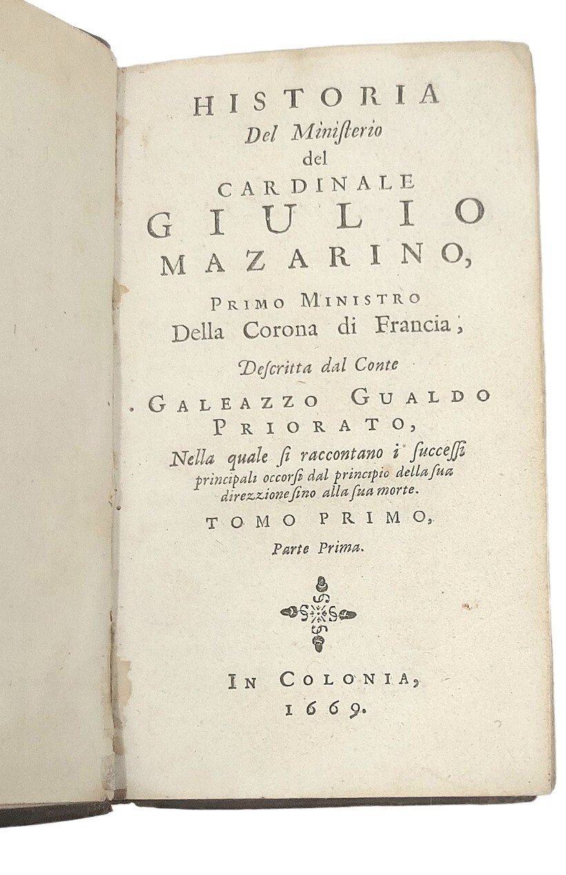 >in-8, pp. (8), 457, (15), legatura coeva in vitello, filetto oro con piccole terminazioni geometriche agli angoli. Prima edizione del primo volume dei soli tre volumi dati alle stampe, impressi ad Amsterdam con il falso luogo di Colonia, di questa ricostruzione storica della vita e dell'operato politico di Giulio Mazzarino (1602-1666) e delle vicende della Francia sotto Luigi XIV. Il noto storiografo e uomo d'armi vicentino Gualdo Priorato (Vicenza, 1606-ivi, 1678) fu in gioventù soldato di ventura. Fu onoratissimo dai sovrani e dai potenti del suo tempo, da Cristina di Svezia al papa a Leopoldo I, di cui fu consigliere e storiografo. Ottimo esemplare. Michel- Michel I, 85. British Library Catalogue of Seventeenth Century Italian Books, I, p. 419. Brunet, VI, 23763. Graesse, III, 166.