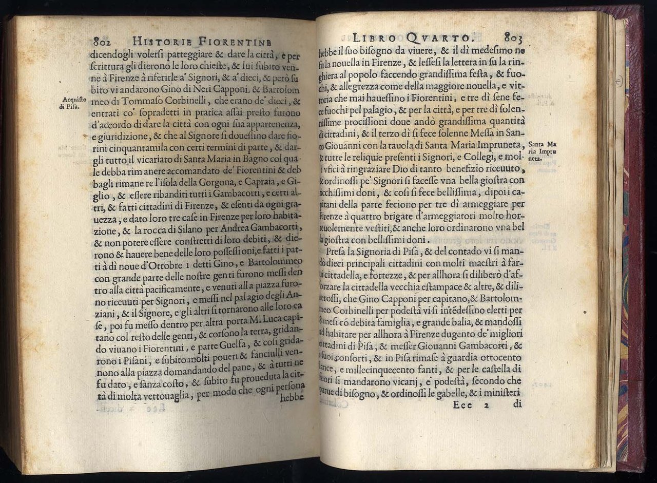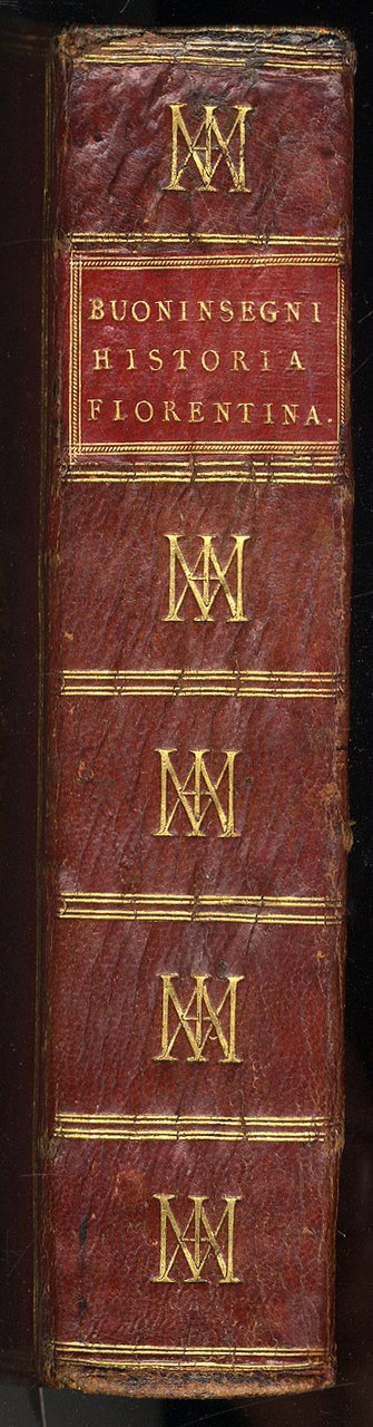 >in-4 (226x128 mm), pp. (40) , 829 , (1 f. bianco), emblema del tipografo sul titolo, iniziali istoriate. Splendida legatura di fine XVI sec. in marocchino granata (lievissime tracce d'uso alle cerniere ed alle cuffie) alle armi di Jacques-Auguste de Thou e della sua prima moglie Marie de Barbançon de Cany, realizzata nel 1587 da Le Gascon. I piatti adorni di triplice riquadro di filetti e al centro impresse in oro le armi accoppiate dei De Thou e Barbançon; dorso liscio con titolo, filetti e monogramma oro intrecciato "IAM" (Jacques-Auguste e Marie) ripetuto 5 volte, tagli dorati. Da notare che l'intersezione tra la A e la M forma la greca theta (Thou). Splendido volume proveniente da una delle più importanti biblioteche cinquecentesche: J.A. de Thou (1553-1617) fu canonico di Notre-Dame, e Presidente del Parlamento di Parigi (contribuì alla promulgazione dell'Editto di Nantes), storico (scrisse la "Storia del suo tempo" e le sue "Mémoires"). Fu tra i più raffinati bibliofili del suo tempo, raccogliendo oltre 9000 volumi: fece rilegare i suoi volumi con le proprie armi e il proprio monogramma, unendovi le armi della prima moglie e poi quelle della seconda moglie, Gasparde de La Chastre e con il monogramma "IAGG". Prima edizione di rara storia di Firenze scritta nel quattrocento da Dom. Boninsegni (1384-1466) e pubblicata dal figlio minore Piero. Esemplare di gran pregio (ex-libris Chatsworth collection). Manca alla Bibliografia Toscana del Moreni. Diz. Biogr. Italiani, XV, 251.