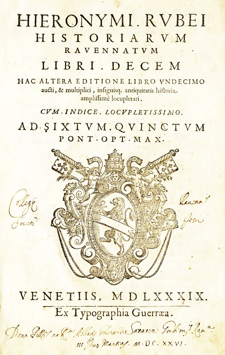 >in-folio, pp. (8), 900 (spostamenti delle pp. 567-574), (68, con carmi, alberi genealogici, colophon, indice ed errata); leg. settec. m. perg., tit. ms. al dorso. Sul titolo grande stemma di Papa Sisto V cui l'opera è dedicata, iniz. e fregi silogr., grande impresa tipogr. in fine. Testo in car. tondo, con ampi passi in corsivo. Adorno di 3 grandi figure silografiche (pp. 897-899), riproducenti pitture ritrovate in chiese della città. Seconda edizione, in parte originale, essendo qui aggiunto per la prima volta il libro undicesimo che abbraccia le pagine da 752 a fine. Vasta dottissima opera sulla millenaria complessa storia civile, religiosa ed artistica di Ravenna. "Il Rossi...nel 1572 la pubblicò in Venezia in X libri colle pregiatissime stampe di Aldo. Nella seconda edizione, che fece nel 1589, accrebbe l'undecimo libro. Ambedue le edizioni sono preziose" (Platner). L'opera venne ancora ristampata nel 1590 e nel 1603, avendo come base la presente edizione. Girolamo Rossi fu il più grande storico ravennate del XVI secolo, non meno stimato di Desiderio Spreti (del sec. XV), del Fabri e del Pasolini (del sec. XVII). Ottimo esempl. (due ex-libris mss. cinquecenteschi sul titolo). Lozzi 3929 (I ediz. 1572). Platner p. 280-1.
