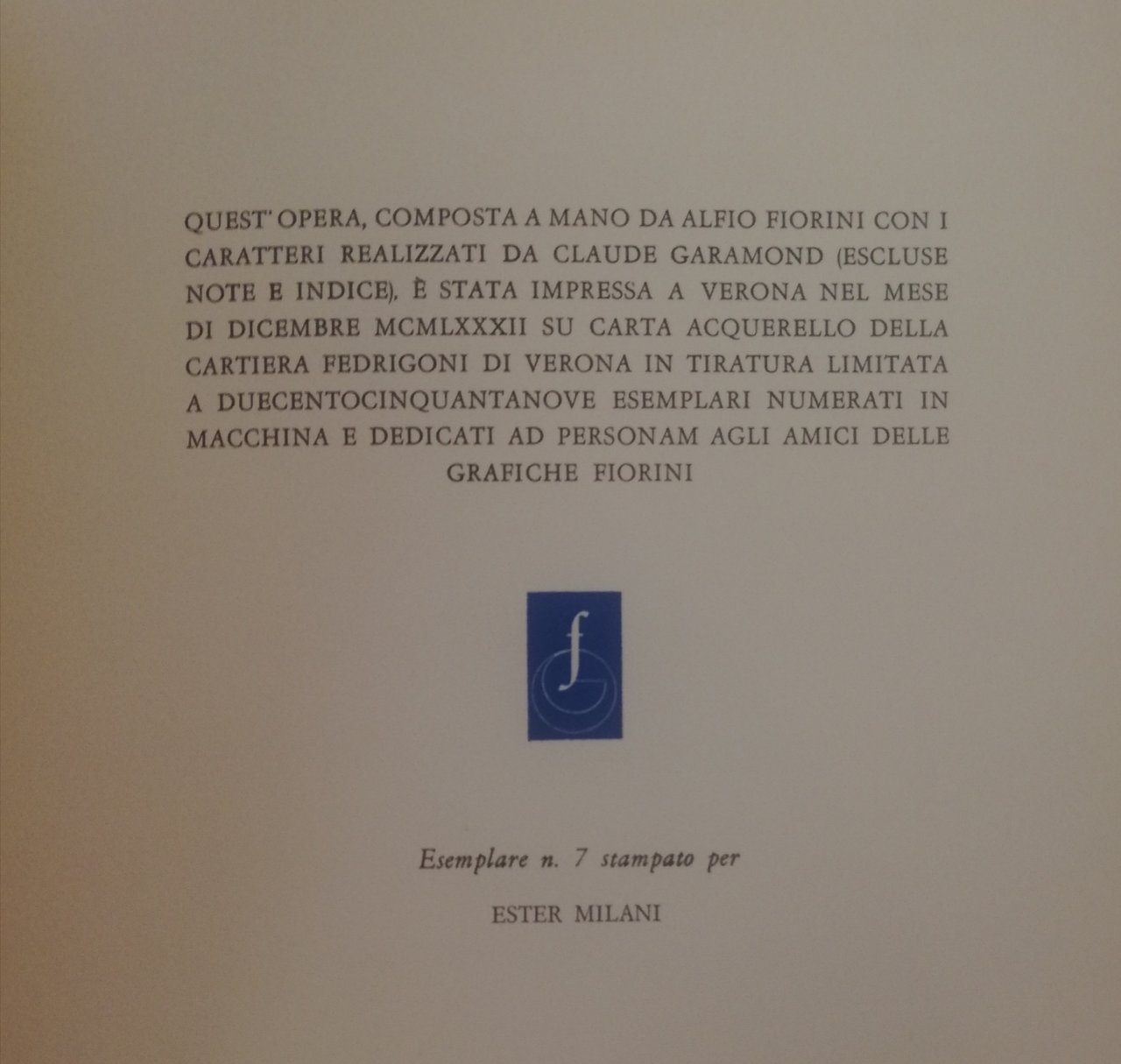 Quest'opera, composta a mano da Alfio Fiorini con i caratteri realizzati da Claude Garamond (escluse note e indice), è stata impressa a Verona nel mese di dicembre 1977 su carta acquerello della cartiera Fedrigoni di Verona in tiratura limitata a 259 esemplari numerati in macchina e dedicati ad personam agli amici delle grafiche Fiorini. Esemplare n. 7. ill. in bianco e nero. in quarto leg. bross. pp. 172 Ottimo (Fine) Ottimo es..