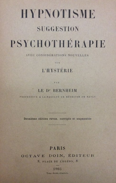 HYPNOTISME, SUGGESTION, PSYCHOTHERAPIE. - Avec considérations nouvelles sur l'hystérie. Deuxième édition revue, corrigée et augmentée.