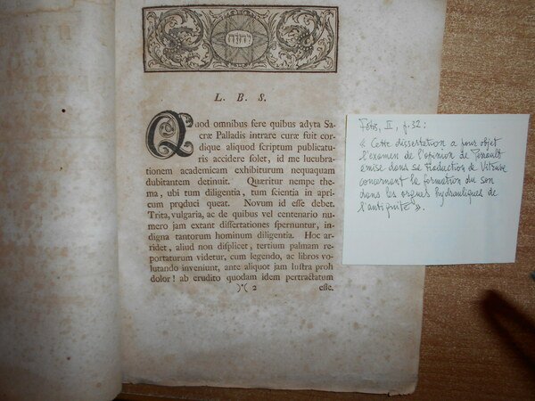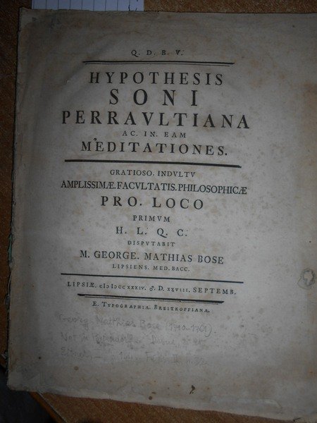 Georg Matthias Bose (1710 - 1761). Lipsiae, E. Typographia Breitkopeiana, 1734. Hypothesis Soni Perraultiana Ac. In. Eam Meditationes. Gratioso. Indultu Amplissimæ. Facultatis. Philosophicæ Pro. Loco Primvm H. L. Q. C. Disputabit M. George. Matthias. Bose Lipsiens. Med. Bacc. In-8°, cop. muta. 54, (1) pp. Questa dissertazione si propone di esaminare l'opinione di Perrault espressa nella sua traduzione Vitruviana riguardo alla formazione del suono negli organi idrolatici dell'antichità. Opuscolo molto raro. Not in Poggendorff. Dobus, p. 215. Eitner, II, p. 144. Fétis, II, p. 32. Uff. pacco opusc. stanz antichi entro busta trasp.