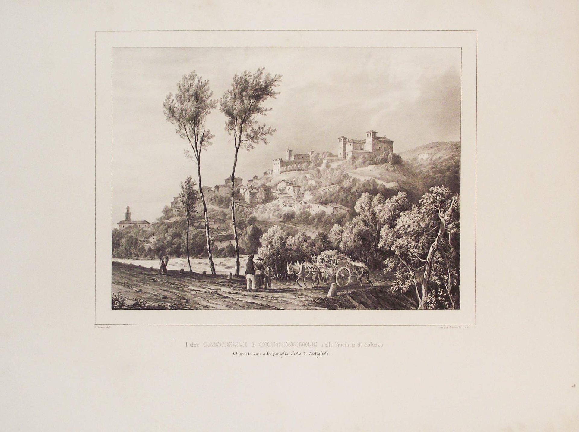 >Litografia originale circa 410x570 mm, firmata da Enrico Gonin quale autore del disegno e da J. Junck, Fr.lli Doyen o D.Festa quali litografi. Bella veduta animata da personaggi in primo piano, è l'unica incisione di Costigliole realizzata prima della metà dell'800. Impressi nel margine inferiore sono il titolo e l'indicazione della famiglia nobile proprietaria. Bell'esemplare a pieni margini tratto dall'Album delle principali Castella Feudali della Monarchia di Savoia. Torino, Fontana, 1841-57, contenente 200 tavole litografiche disegnate e litografate da Enrico Gonin impresse a Torino da D. Festa, Junck e Doyen, celebre serie di vedute dei castelli e ville del Piemonte e Valle d'Aosta Enrico Gonin (Torino, 1798-1856), fratello del più noto pittore Francesco; discepolo di Pietro Giovanni Palmieri, ereditò da questi l'arte litografica, e lavorò profusamente per gli editori Marietti, Doyen e Fontana. Queste vedute, espressione di un tardo romanticismo pittorico, oltre ai loro pregi artistici e alla loro importanza per la storia dell'arte litografica in Piemonte, costituiscono un documento di eccezionale valore per lo studio del patrimonio monumentale del Piemonte.Buon esemplare a pieni margini.