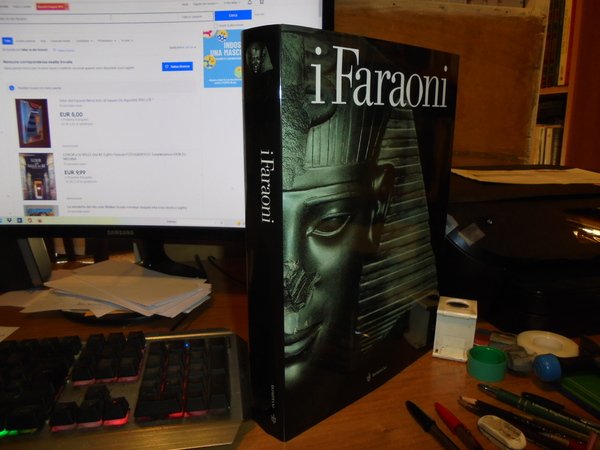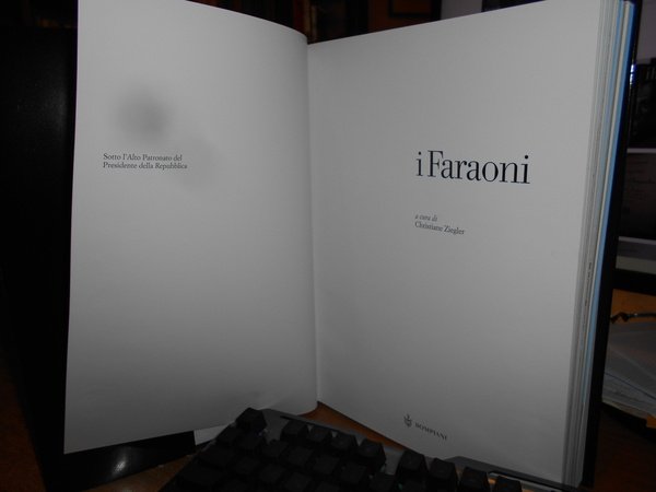 Curatrice: ZIEGLER, CHRISTIANE. Milano, Bompiani, 2002. I FARAONI. In-4°, tela nera edit. con sovracopertina ill. a col. 511, (1) pp. con numerose illustrazioni fotografiche a colori nel testo anche a piena pagina. Catalogo della mostra tenutasi a Palazzo Grassi, Venezia. Sommario: I faraoni e la storia - La regalità faraonica. La natura del potere - Lo stato e l'amministrazione - Il faraone guerriero. La conquista del mondo - Il faraone ritualista. Il culto divino - Il faraone costruttore. I templi - L'immagine del sovrano - La famiglia reale - Il palazzo reale. Architettura, decorazione e arredi - Le tombe reali - Le mummie reali - Catalogo delle opere esposte - Cartine, Cronologia, Bibliografia. Esemplare in stato di nuovo. Uff. stanzetta mob. a destra.