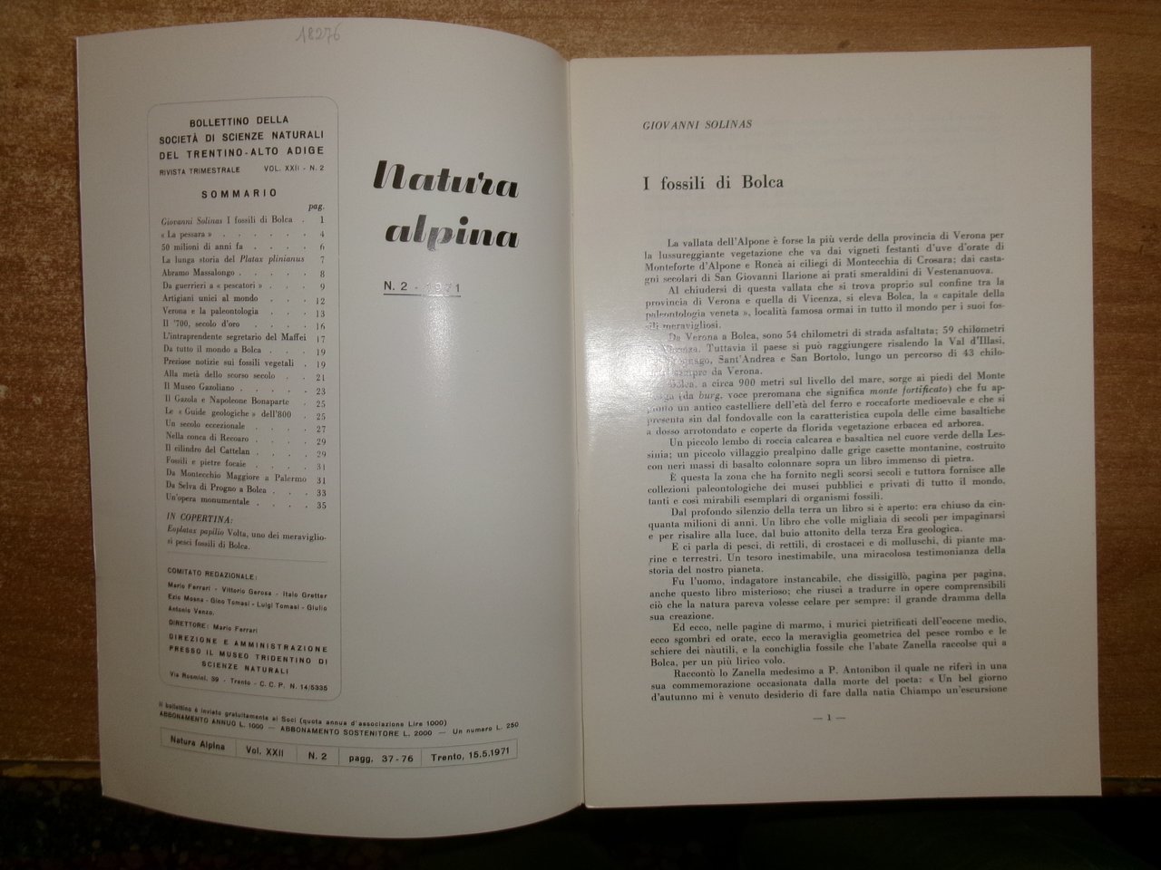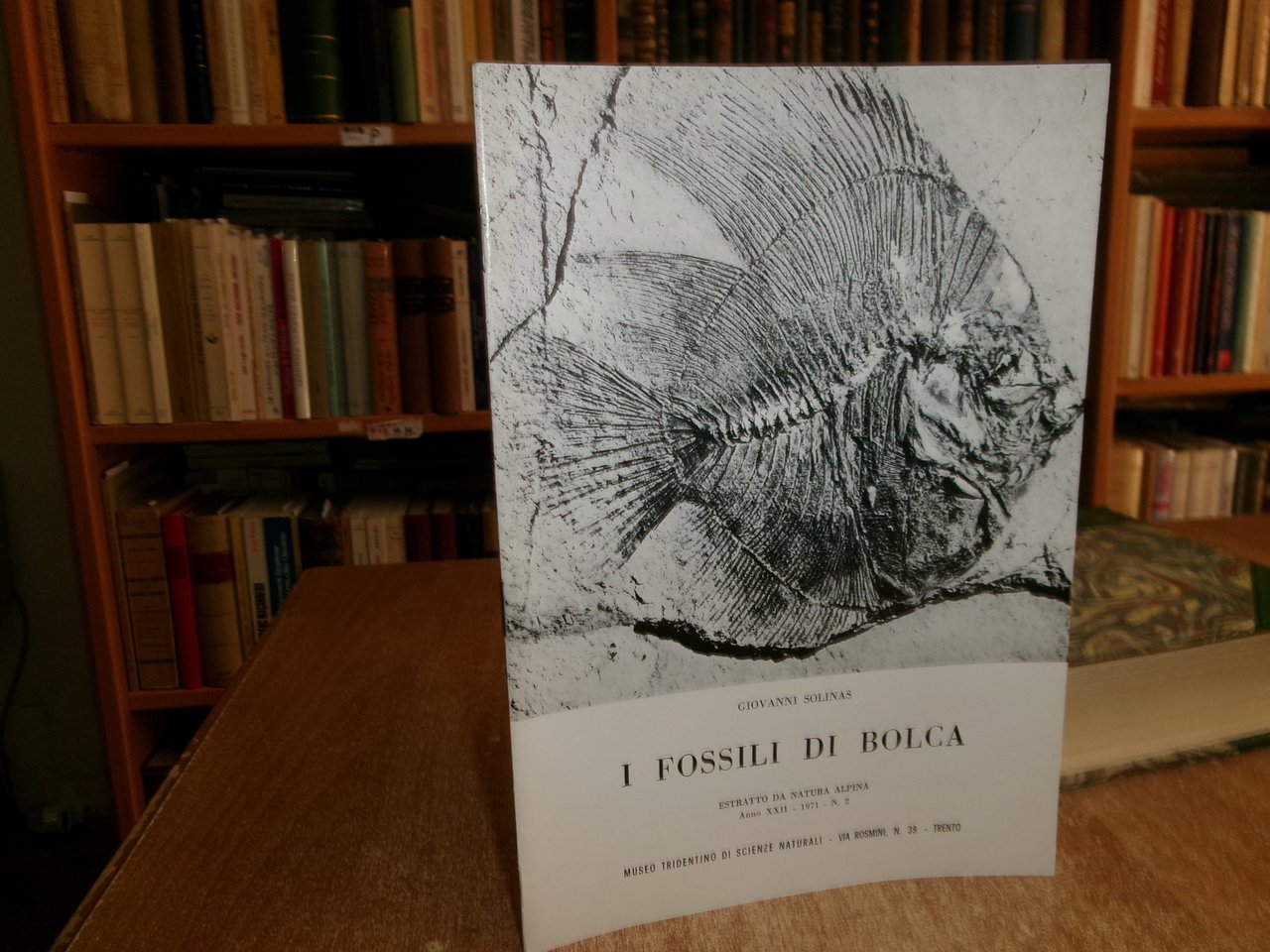 GIOVANNI SOLINAS. Trento, Temi, Tipografia Editrice, 1971. I Fossili di Bolca (Estratto da Natura Alpina Anno XXII . 1971 - n. 2. In-8°, br. con punti metallici. 36 pp. con illustrazioni n.t. Come nuovo. Neg. nat. mob. 0 entro busta trasp.