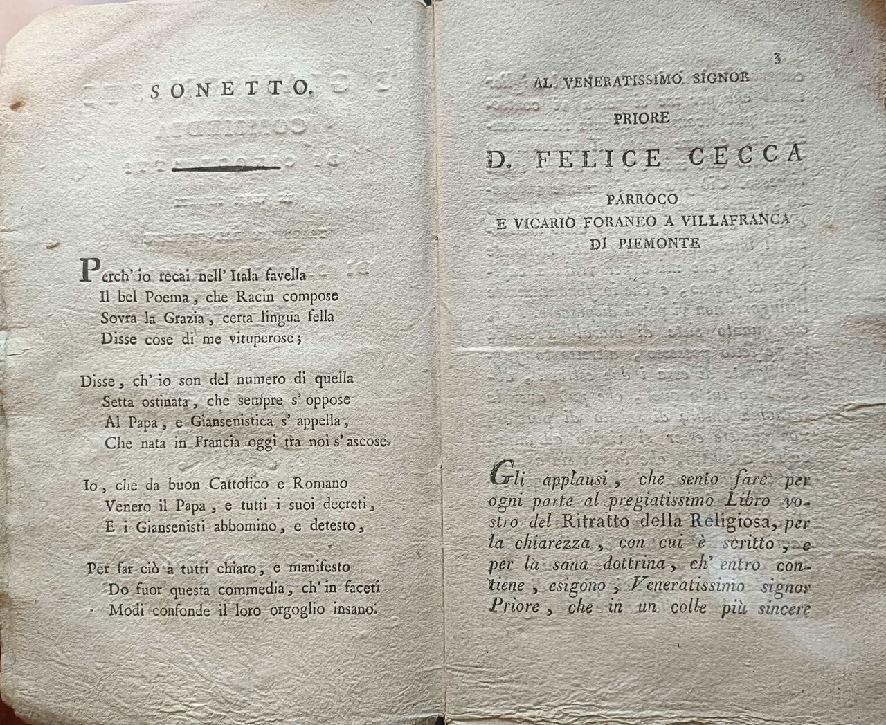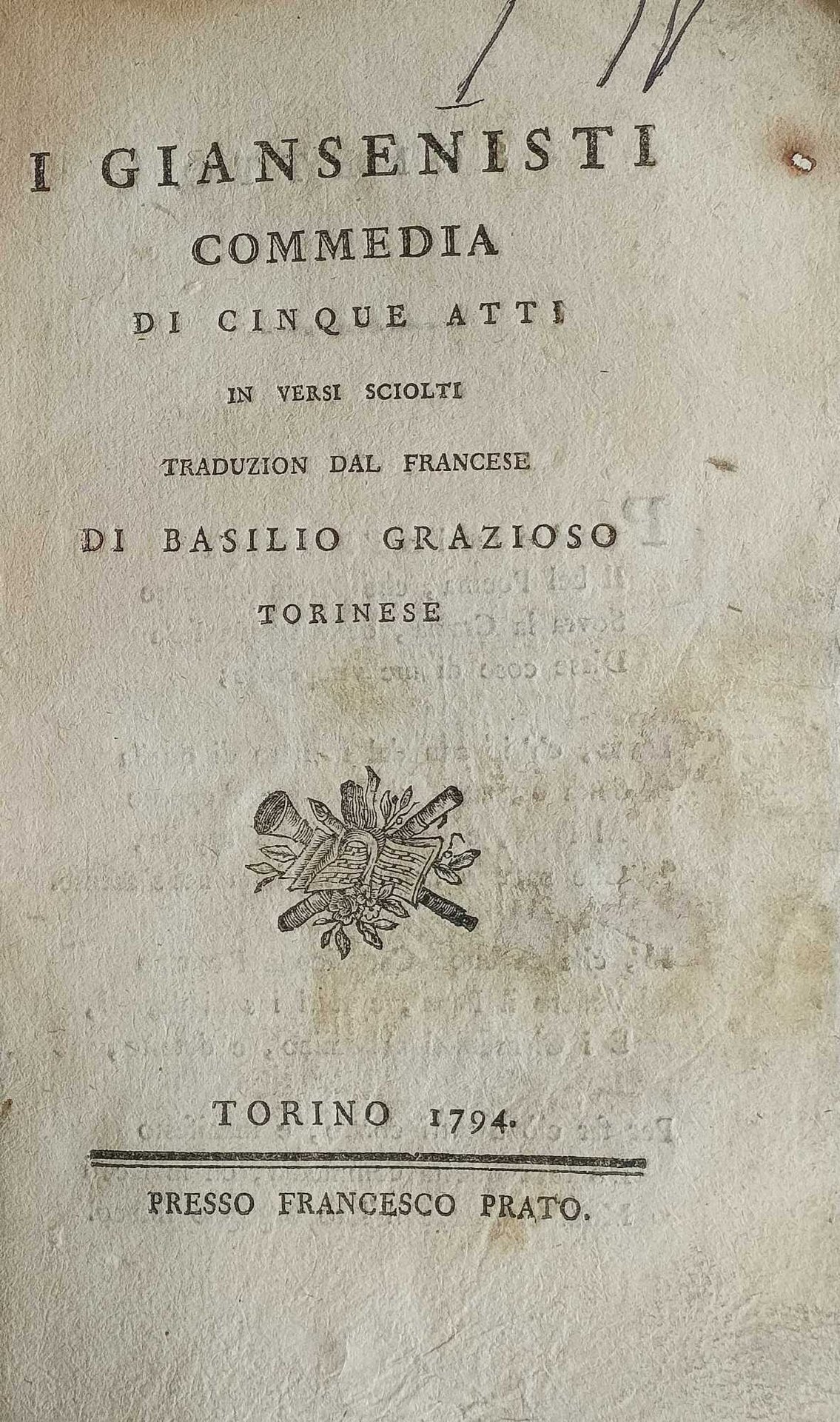 >in-16, pp.128, broch. edit. muta. Dedica dell'editore al ''Priore D. Felice Cecca parroco e vicario foraneo a Villafranca di Piemonte''. E' probabile che il Grazioso sia anche autore di questa commedia, della quale, invece, si finge solo traduttore per evitare l'accusa di giansenista e la conseguente condanna, come sembra di capire leggendo il sonettto al verso del titolo. Edizione originale, non comune. Non riscontrato in alcun repertorio.