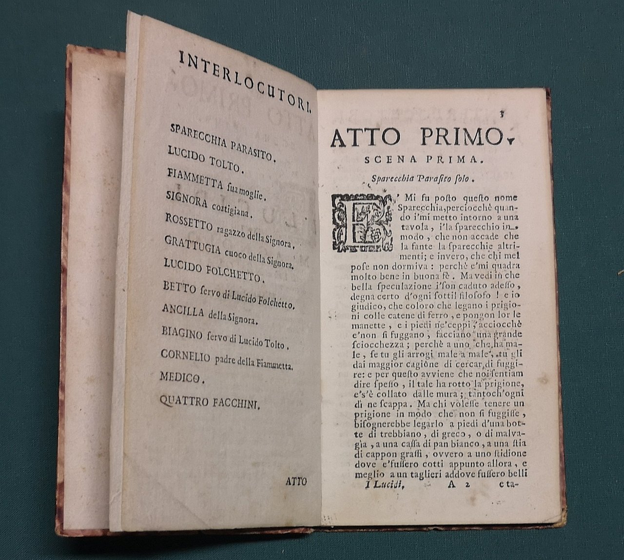 >in-12, pp. 84, leg. cart. epoca. Grande impresa tipogr. in fine. Il titolo generale di quest'edizione ''fatta a Napoli per cura di editore intelligente'' (Gamba n. 461) è ''I Lucidi e la Trinuzia. Commedie''. Bell'esempl. Decia-Delfiol, I Giunti di Firenze I, n. 287, note.