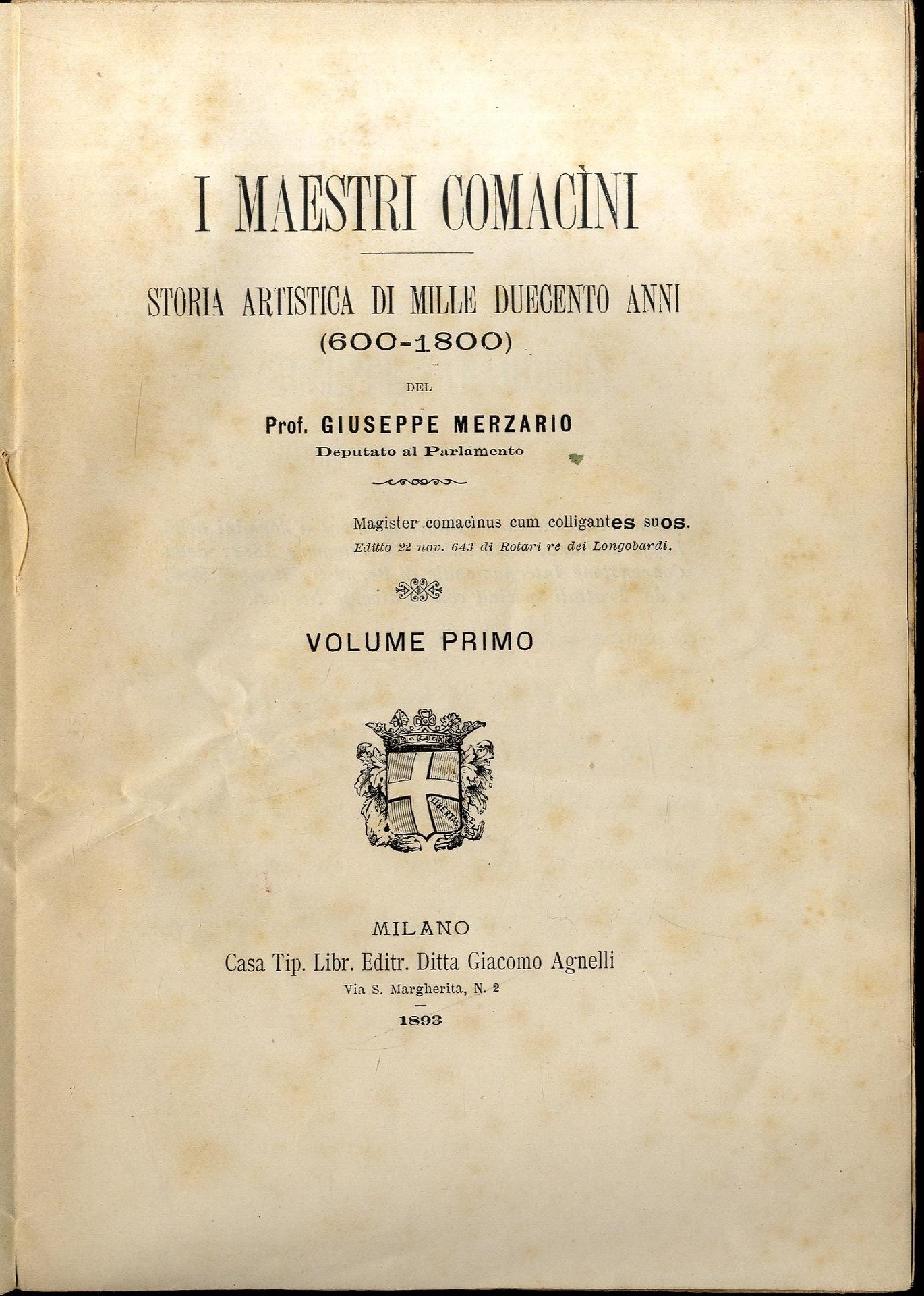 >2 vol. in-4, pp. XXVII, 696; XXIII, 626, (2); bella leg. in p. percallina edit. borgogna, titolo e fregi in oro al dorso e al piatto ant., impresa edit. a secco sul piatto post., in astuccio. Edizione originale di questa importante storia monografica documentaria degli artigiani (muratori, carpentieri e lapicidi, scultori, architetti e pittori) dell'Alta Lombardia noti come ''comacini'', che ebbero un'importanza fondamentale nell'affermazione del primo romanico. Si tratta dell'opera indubbiamente più completa ed esaustiva sull'argomento. Buon esemplare.
