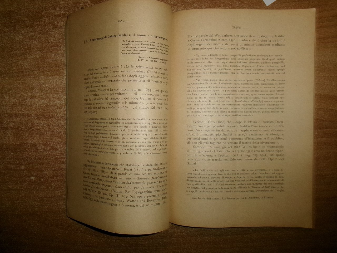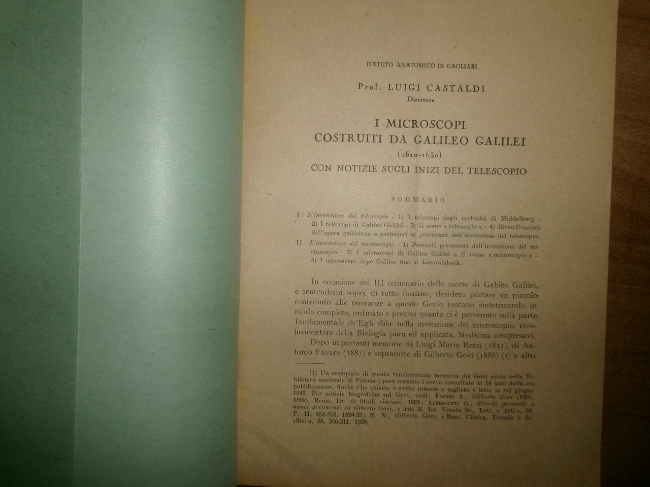 CASTALDI LUIGI. Firenze, Tipocalcografia Classica, 1942. I MICROSCOPI costruiti da GALILEO GALILEI (1610-1630). In-8°, br. orig. LXVii pp. con una illustrazione n.t. Opuscolo in ottimo stato. Neg. mob. 2 entro busta trasp.