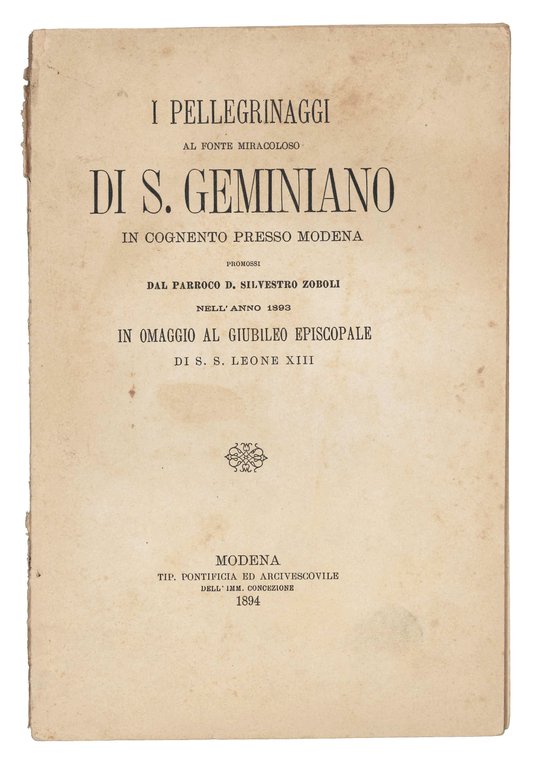 I pellegrinaggi al fonte miracoloso di S. Geminiano in Cognento presso Modena. | Rare and modern books | ZOBOLI, Silvestro