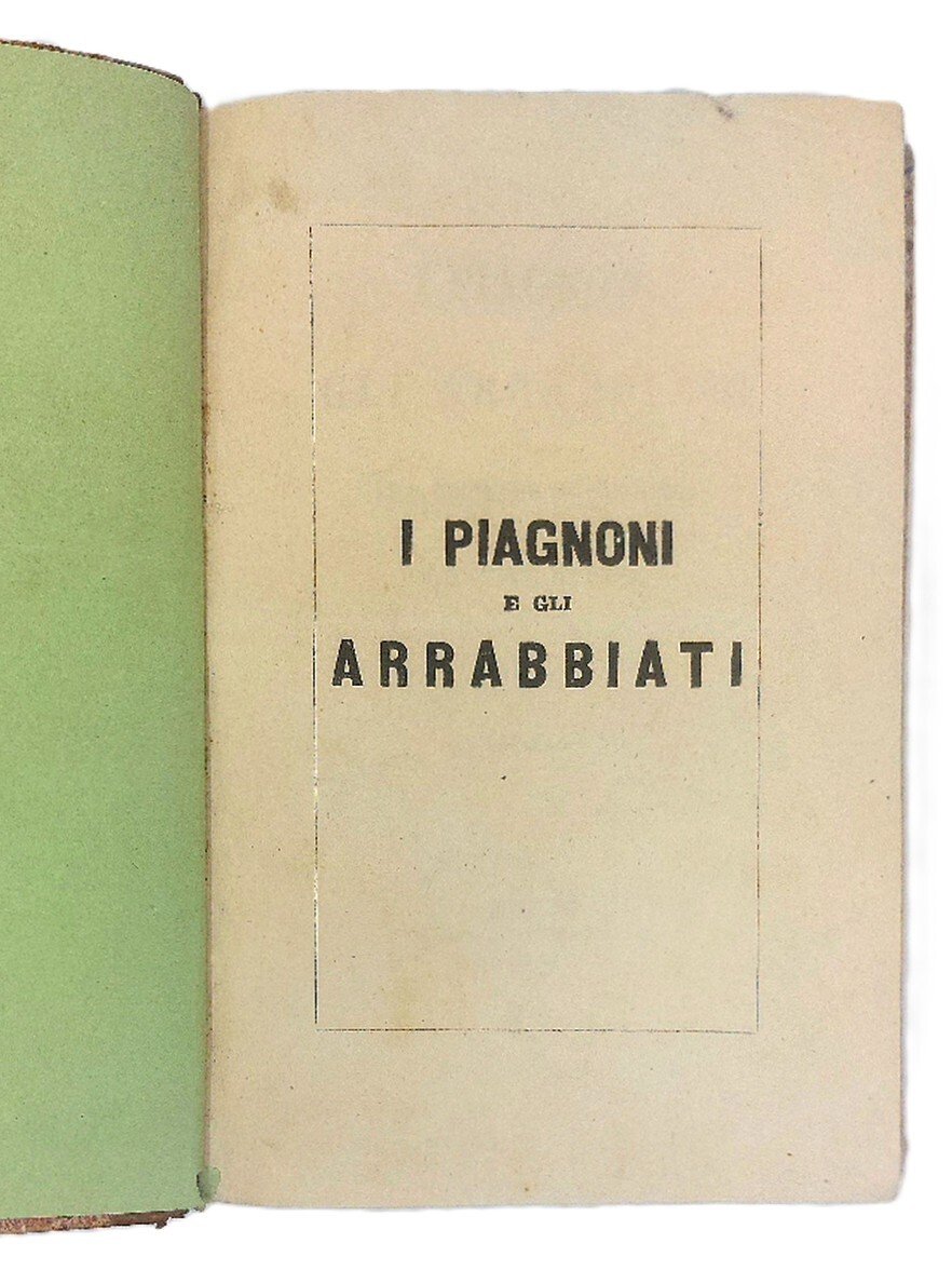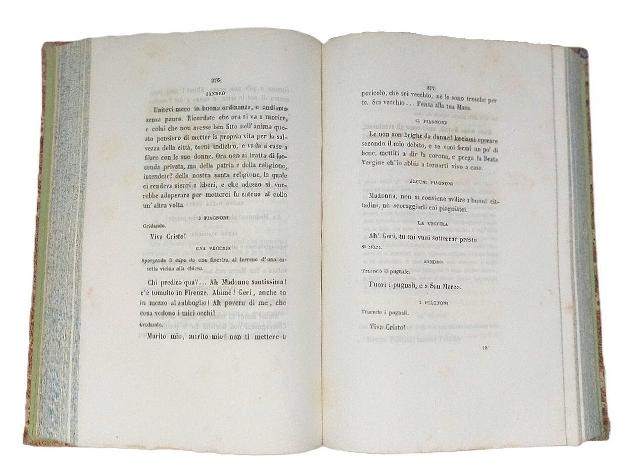 >2 volumi in un tomo in-8, pp. (4), 281, (3); 307, (5); legatura coeva in mezza pelle, dorso a nervi con tit. e fregi oro. Edizione originale di questo dramma storico in prosa, dal Sanesi considerato ''vigorosa raffigurazione di eventi e di uomini, inquadrati in una serie progressiva di incalzanti scene episodiche'' (Renda-Operti, Diz. st. lett. ital., p. 976). Oltre che letterato, Revere (Trieste 1812-Roma 1889) fu anche cospiratore e patriota mazzianiano, partecipando attivamente alla causa della libertà nazionale. Ottimo esemplare. Parenti 427.