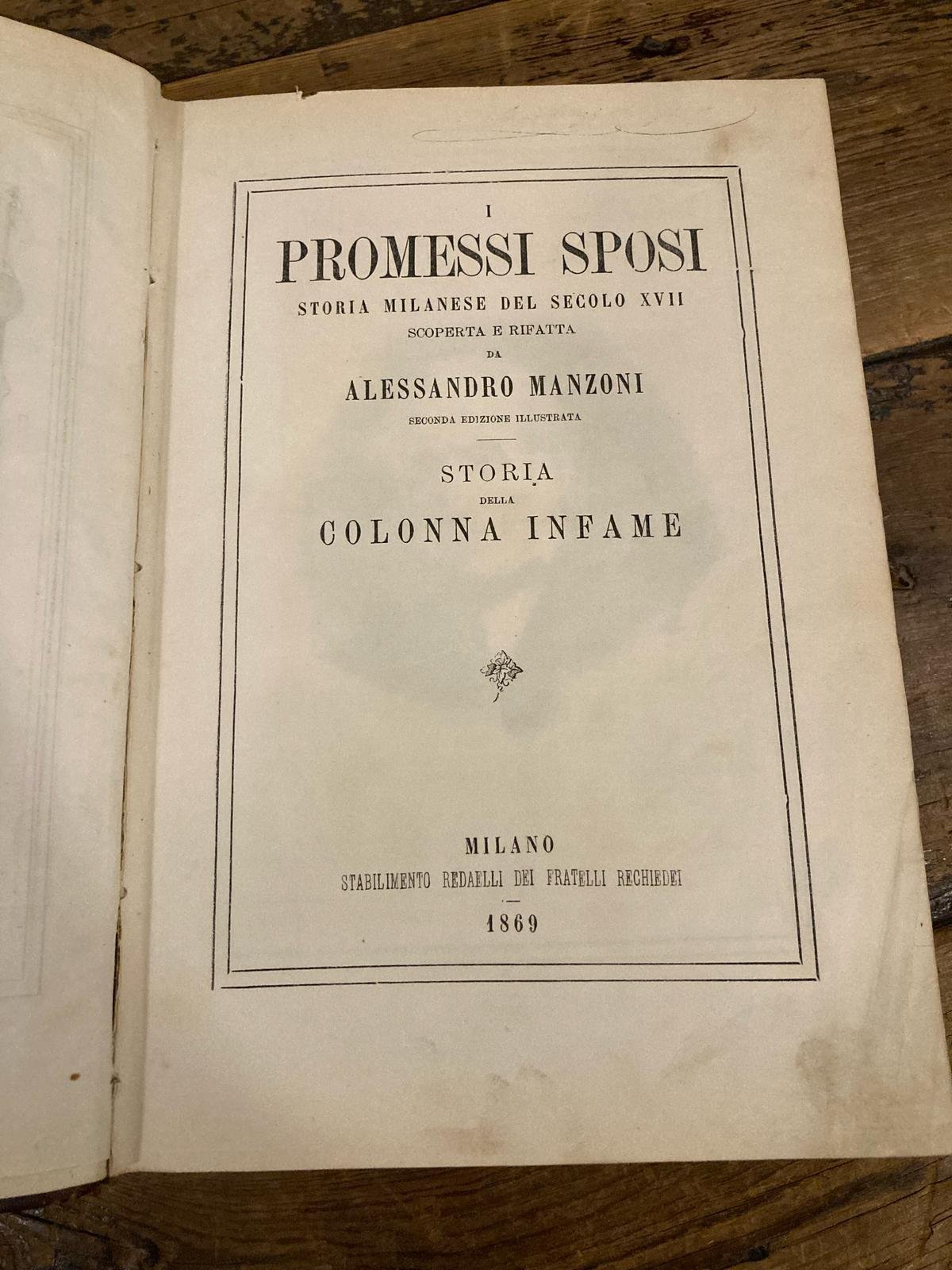 In-4° (25x17 cm), pp. 1031 (1), mezza pelle coeva con titoli e fregi dorati al dorso a cinque falsi nervi, tagli spruzzati azzurri. Occhietto figurato, all' antiporta ritratto di Manzoni. Centinaia di incisioni xilografiche n.t., quasi tutte riproducenti quelle del Gonin per la Quarantana, ma con l'aggiunta di 8 tavole realizzate ex-novo da Tranquillo Cremona e dal Borgomainerio. Testo stampato entro duplice filetto. Mknmi difetti agli angoli esterni della legatura. Bell' esemplare. Terza edizione illustrata (malgrado l'erronea dicitura di 'seconda edizione illustrata'), dopo la celebre Quarantana e dopo la reimpressione del 1844. La prima edizione illustrata era stata pubblicata da Redaelli, la cui azienda, con l'intero magazzino, venne poi rilevata da Rechiedei. Il Parenti rileva come l'edizione sia assai più rara della Quarantana. Cfr. Parenti, Rarità bibliografiche dell'Ottocento, I, 276; Parenti, Bibliografia manzoniana, p. 105 e passim: 'Anche in questa edizione, come in quella del '40, si trovano, benchè in proporzione minore, divergenze di lezione fra esemplare ed esemplare, ciò che avvalorerebbe l'importanza attribuita da alcuni studiosi moderni a questo testo che parrebbe aver avuto la personale assistenza dell'autore'; Vismara, n. 94. Salveraglio, n. 176; Giujusa, Bibliografia critica delle edizioni in lingua italiana nazionali e straniere de I Promessi Sposi, 150.