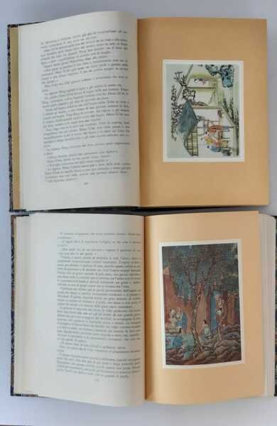 Due volumi. Ottavo (24,5 x 17 cm). 1903 p. Volumi illustrati con 32 tavole fuori testo riproduzioni di autentiche stampe cinesi. Legatura in tessuto espressamente disegnato e fabbricato dalla Ditta E. Rosasco di Como, con talloncini dorati con titoli al dorso e antiporte illustrate, completi di unico cofanetto editoriale in plastica trasparente. Esemplari in buonissimo stato, dedica manoscritta, non invasiva, datata 1956.