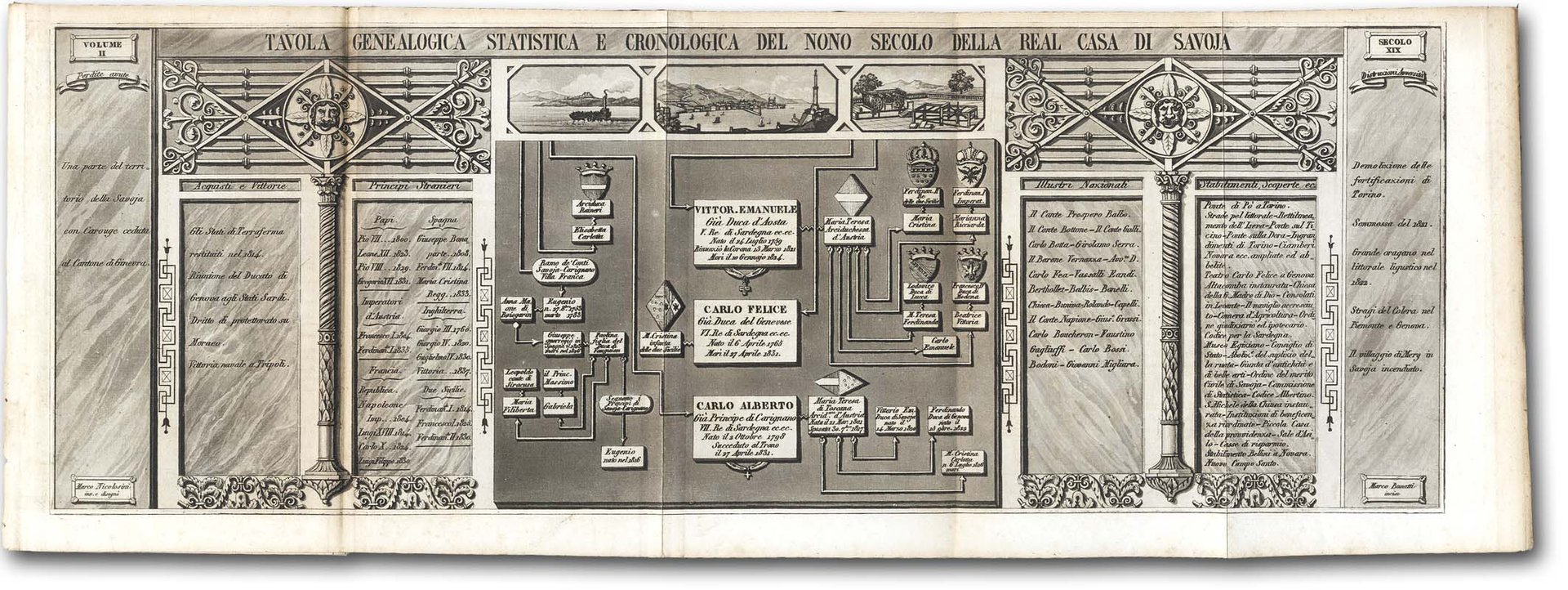 >2 volumi in-8, pp. (12), 469, 682, ben legati in m. pelle, fregi a secco e titolo in oro ai dorsi. Illustrati da 9 grandi tavole più volte ripiegate. Prima edizione (fu ristampata nel 1840) di opera che esalta i nove secoli di storia sabauda. Le tavole, incise all'acquatinta da Stucchi e stampate in bistro, sono graficamente assai elaborate, ricche di cartigli, colonne, stemmi e vedutine; l'autore avverte che ''i rami, insieme collegati, potranno divenire il soggetto di una carta generale, storico-genealogica, statistica e cronologica, del nostro paese''. L'edizione è davvero rara sul mercato. Buon esemplare con poche fioriture, qualche piega parzialmente strappata. Manno I, 5561.