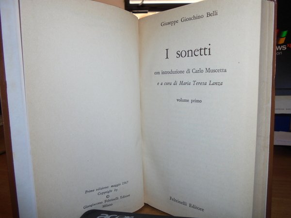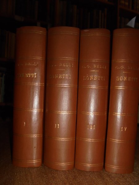 Giuseppe Gioachino Belli. Milano, Feltrinelli Editore, 1963. I Sonetti con introduzione di Carlo Muscetta e a cura di Maria Teresa Lanza. 4 volumi in-16°, similpelle con titoli a i dorsi. Complessive 2501 pp. Tagli leggermente bruniti ma volumi ben conservati. Uff. TV. mob. nostro carc.