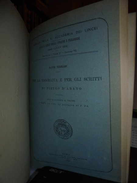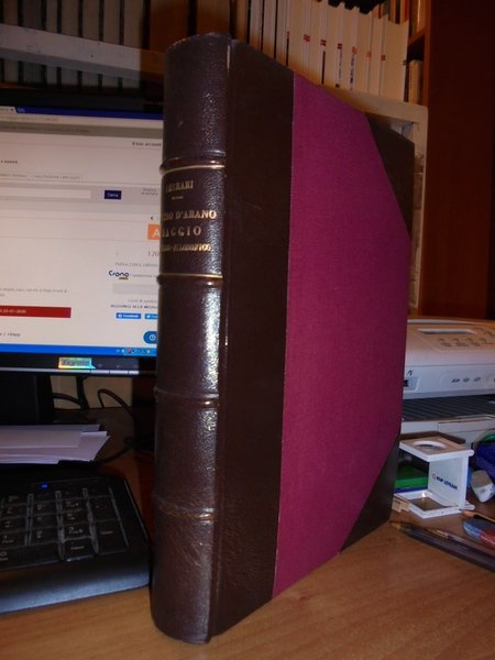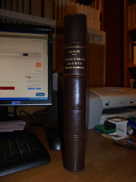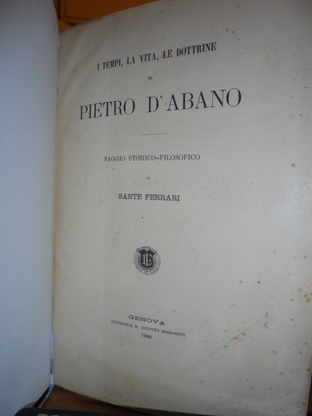 I Tempi, la Vita, le Dottrine di PIETRO D' ABANO. Saggio Storico-Filosofico di DANTE FERRARI. Genova, Tipografia B. Istituto Sordomuti, 1900. In-8°, m. pelle coeva con grandi angoli, dorso a nervi con titolo in oro. xvi, 725, (1) pp. Con l' aggiunta di Sante Ferrari R. Accademia dei Lincei per la Biografia e per gli scritti di Pietro D' Abano. Note ed aggiunte al volume. Esemplare completo. Uff. C . IV - 5