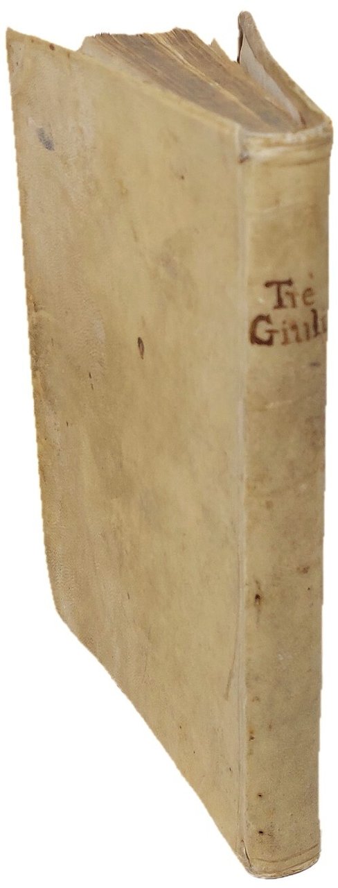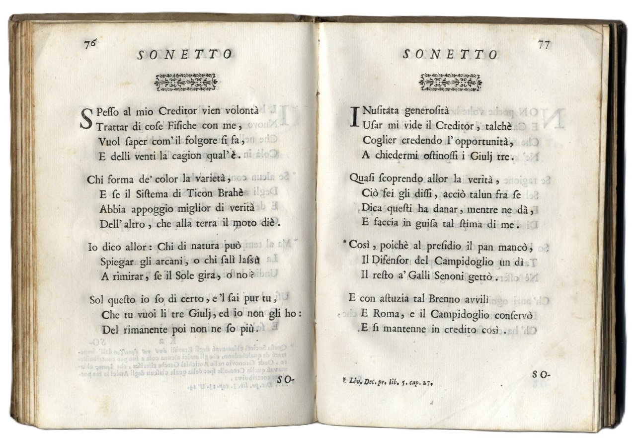 >in-4 piccolo (190x130 mm), pp. XVIII, (2 di occhietto), 200, graziosa incisione di scena arcade al frontespizio, iniziali e fregi in xilografia. Legatura coeva in piena pergamena rigida, titolo ms. al dorso. Prima edizione. Niceste Abideno è lo pseudonimo di Giovanni Battista Casti che sigla, a p. XV, la seconda dedica a Giambattista Luciani. Non comune raccolta di sonetti, elegantemente impressa, incentrata sul tema di un debito di tre giuli. Opera prima di Casti, che fu autore de Gli Animali Parlanti e di numerosi libretti d'opera, alcuni dei quali, come il celebre De Tartari, furono musicati da Salieri. Bell'esemplare, genuino, lievi e sporadiche arrossature sui margini di alcuni fogli, ex-libris al contropiatto anteriore.
