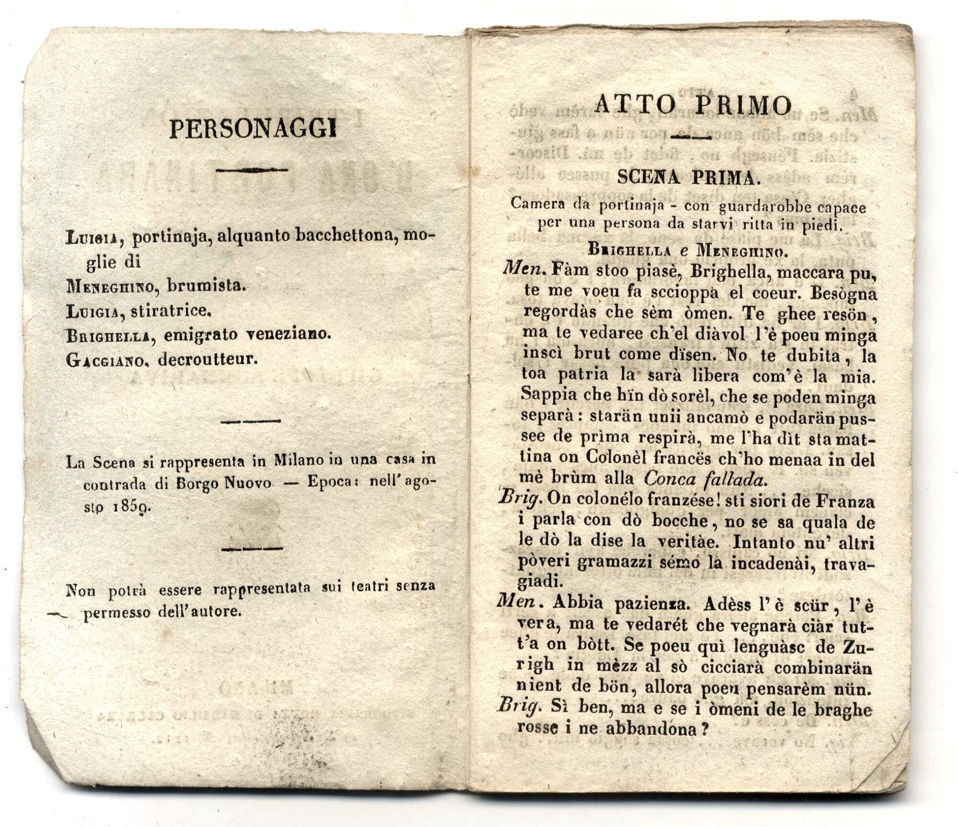 >in-16 (mm 137x80), pp. 48, brossura originale, titolo entro cornice tipografica al piatto anteriore e notizie editoriali a quello posteriore (pochi usuali strappetti e dorso rinforzato). Rara edizione. Opuscolo della commedia in tre atti, in dialetto milanese. Buon esemplare (leggere arrossature su alcune pagine). Manca a Cat. Hoepli e a Fam.Meneghina.