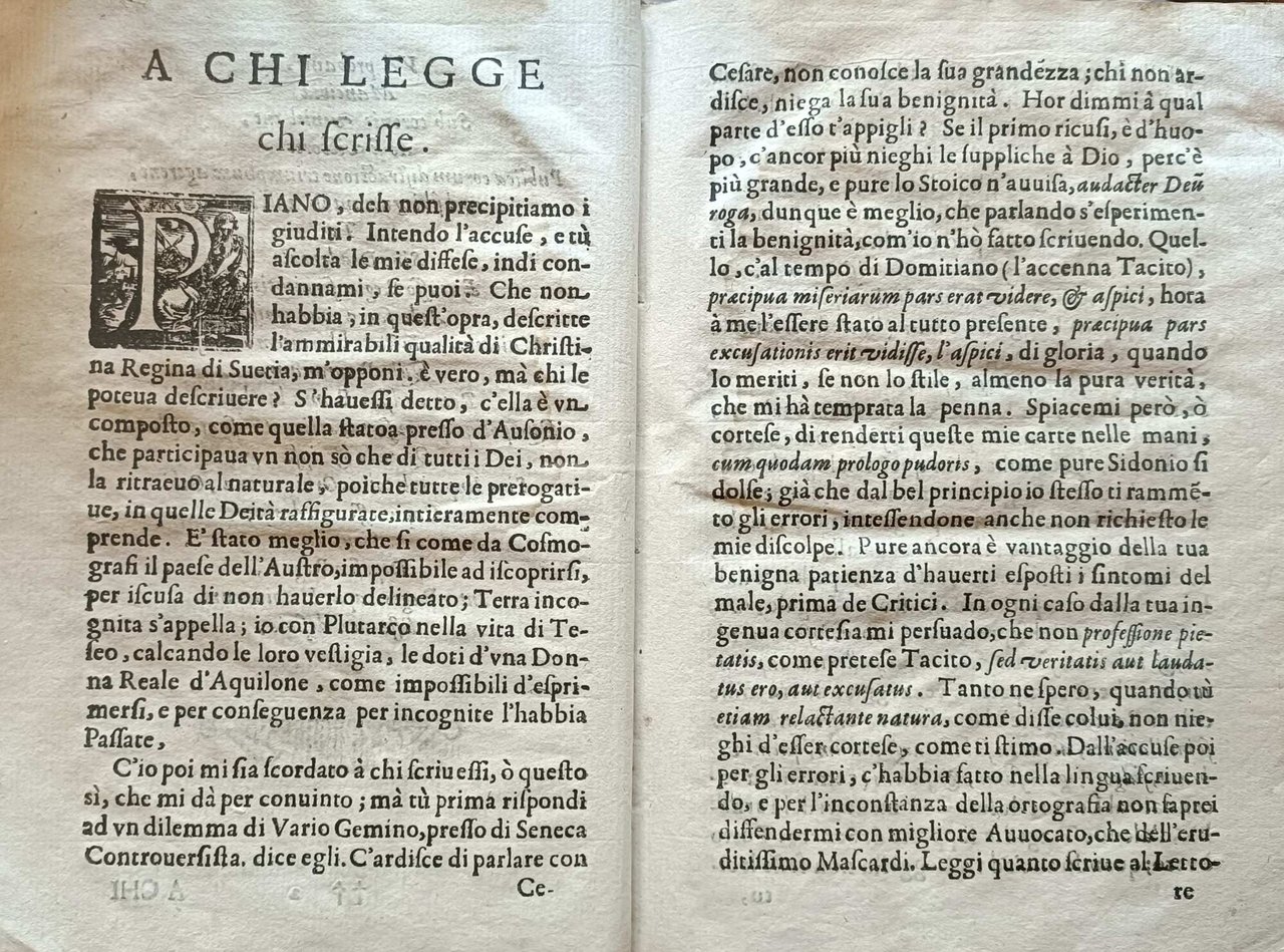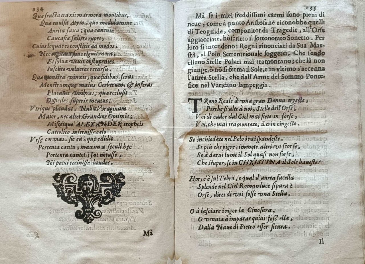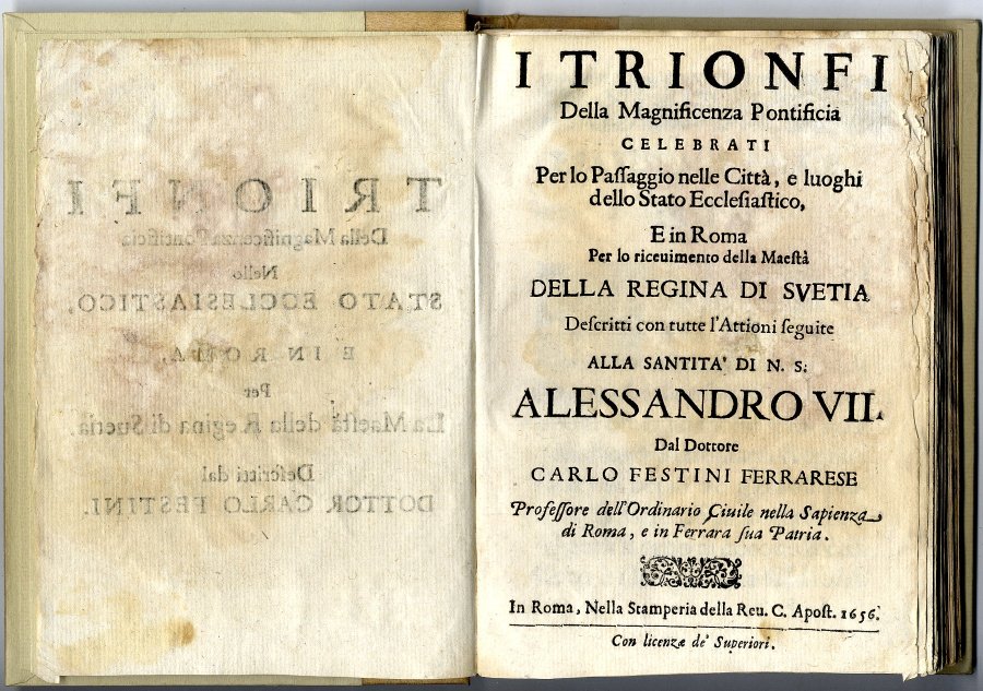 >In-8, pp. (16) 175 (1) , legatura moderna in cartone, titolo in oro al dorso. Tutto il volume è interessato da gore d'acqua. Il ferrarese Carlo Festini descrisse dettagliatamente in quest'opera i grandiosi festeggiamenti voluti da papa Alessandro VII in occasione dell'arrivo della singolare Regina svedese. Fu questo il primo viaggio a Roma di Cristina di Svezia dopo la sua conversione al cattolicesimo. L'accoglienza fu particolarmente fastosa per sottolineare la grande importanza di questa abiura e il conseguente successo del papato. Opera non comune.