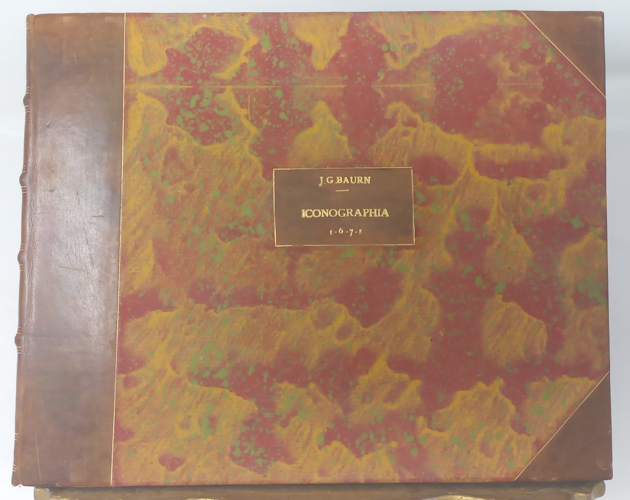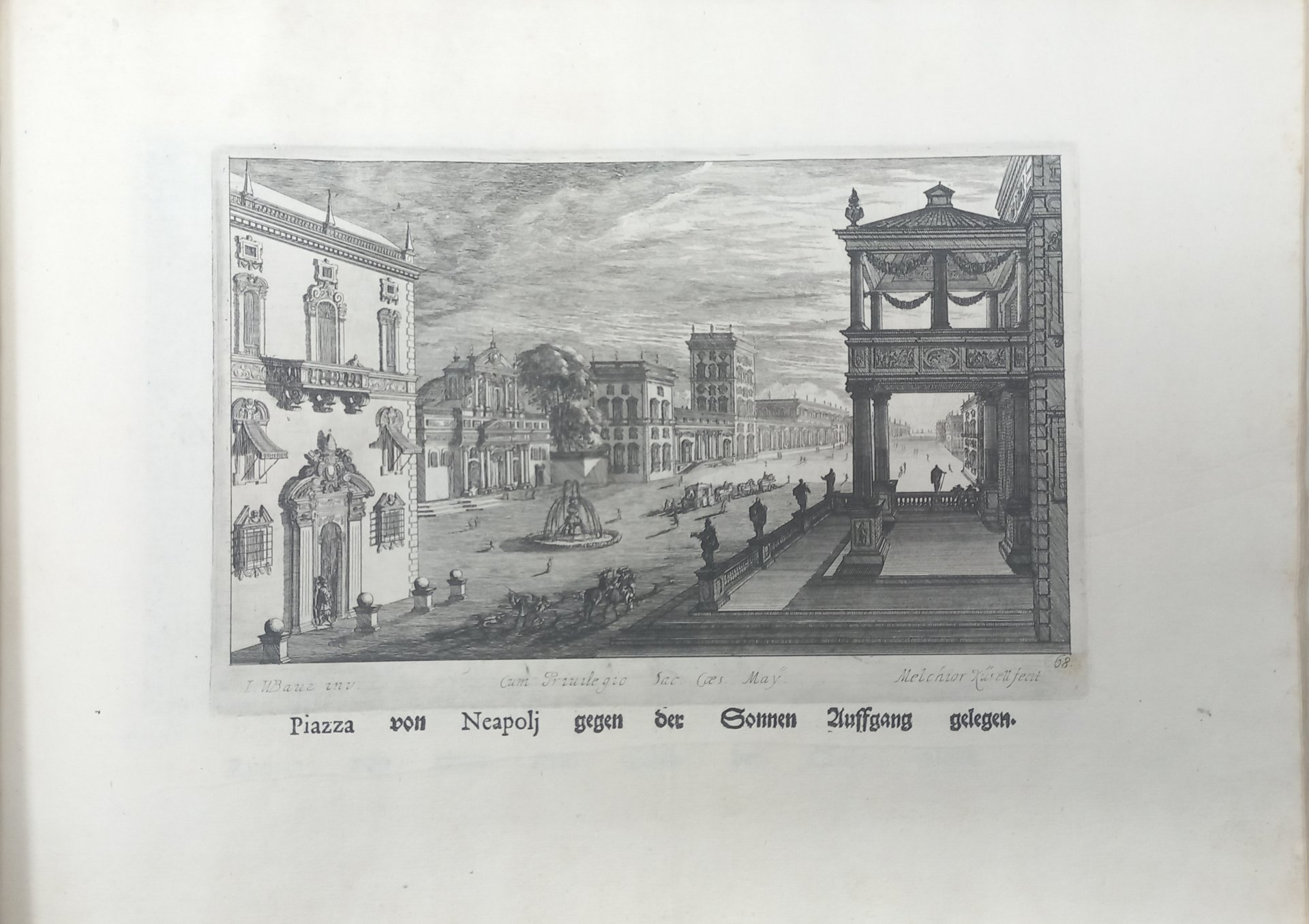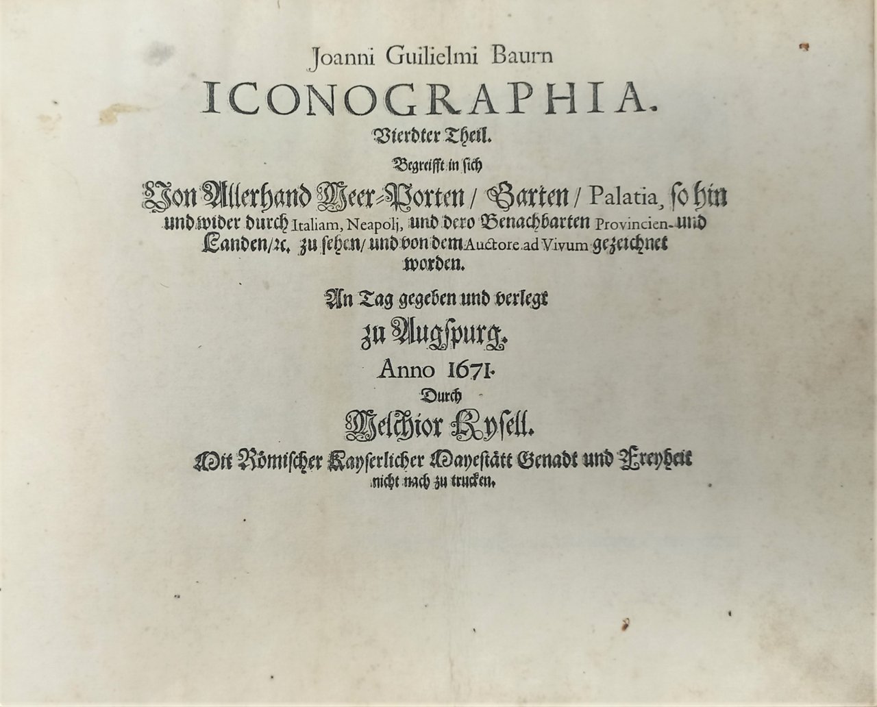 >in-4 oblungo (255x311 mm), titolo e 37 incisioni in rame, legatura posterione mezza pelle e angoli, titolo inciso in oro su tassello posto al centro del piatto superiore, data e fregi oro al dorso a nervi. Raccolta di incisioni assai nitide riguardanti l'Italia con vedute di giardini, ville e palazzi di varie vedute di città italiane: Pozzuoli, Ancona, Livorno, Firenze, Napoli, Murano, Roma, Venezia... Dettagliate raffigurazioni architettoniche animatissime da personaggi, incisioni di Melchior Küsell (1622-1683) tratte dai disegni e dipinti di Joanni Guilielmi Baur, realizzati negli anni trenta del '600 durante il Grand Tour. Strappetti maldestramente restaurati al margine bianco di due tavole. Per il resto buon esemplare.
