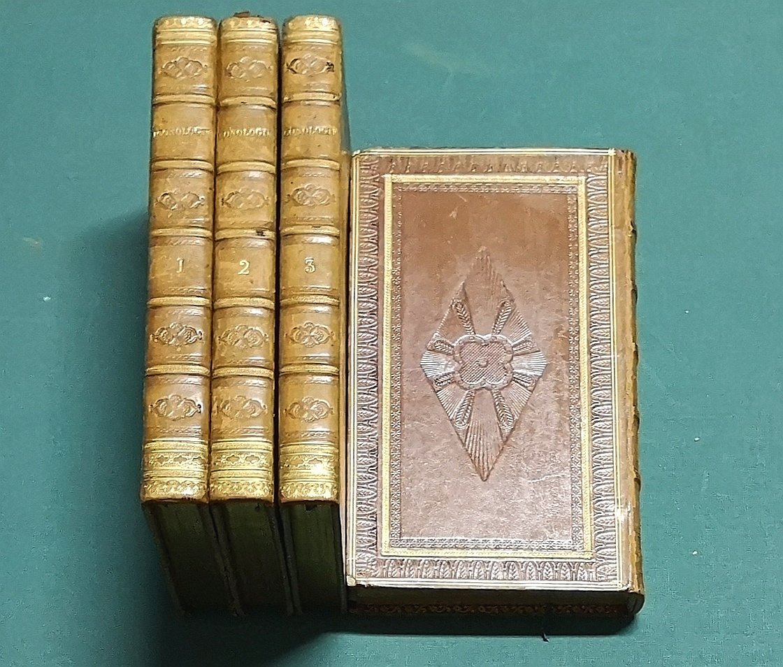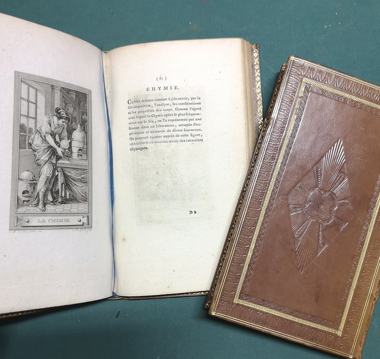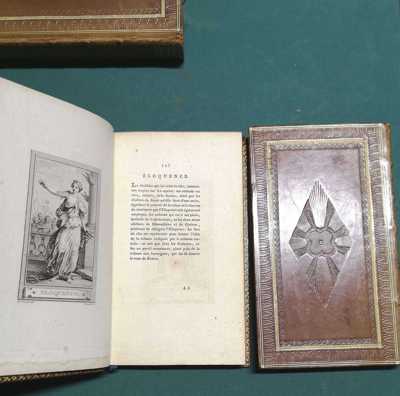 >4 vol. in-12 gr., pp. (2), XVI, 99; (2), 112; (2), 106; (2), 167; elegante legatura romantica in p. vitello chiaro con bordure a secco ed in oro sui piatti, al centro dei quali è inciso a secco un fregio romboidale, dorsi a nervi con tit. e fregi a secco ed in oro, tagli dor., dentelle int. L'opera è corredata di 2 ritratti, 4 titoli incisi e complessive 202 tavole (rispettivamente: 45, 48, 49, 60) disegnate dagli artisti Hubert-François Bourguignon, detto Gravelot, e Charles-Nicolas Cochin e magistralmente incise da Choffart, Simonet, Longueuil, Massard, St. Aubin, Masquelier, De Launay ed altri. Esse, con estrema eleganza e finezza, ritraggono figure femminili simboleggianti, in ordine alfabetico, vizi e virtù, scienze ed arti, mesi e stagioni, le quattro parti del mondo e molti concetti astratti. Le figure erano già apparse, con diverso ordine, periodicamente in ''Almanach Iconologique ou des Arts'' pubblicato da Gravelot nel 1764-73 in 10 vol., proseguito e pubblicato da Cochin dal 1774 al 1780 in 7 vol. Magnifico esemplare. Cohen-Rici 456-7. Praz p. 357-8. Vinet n. 882