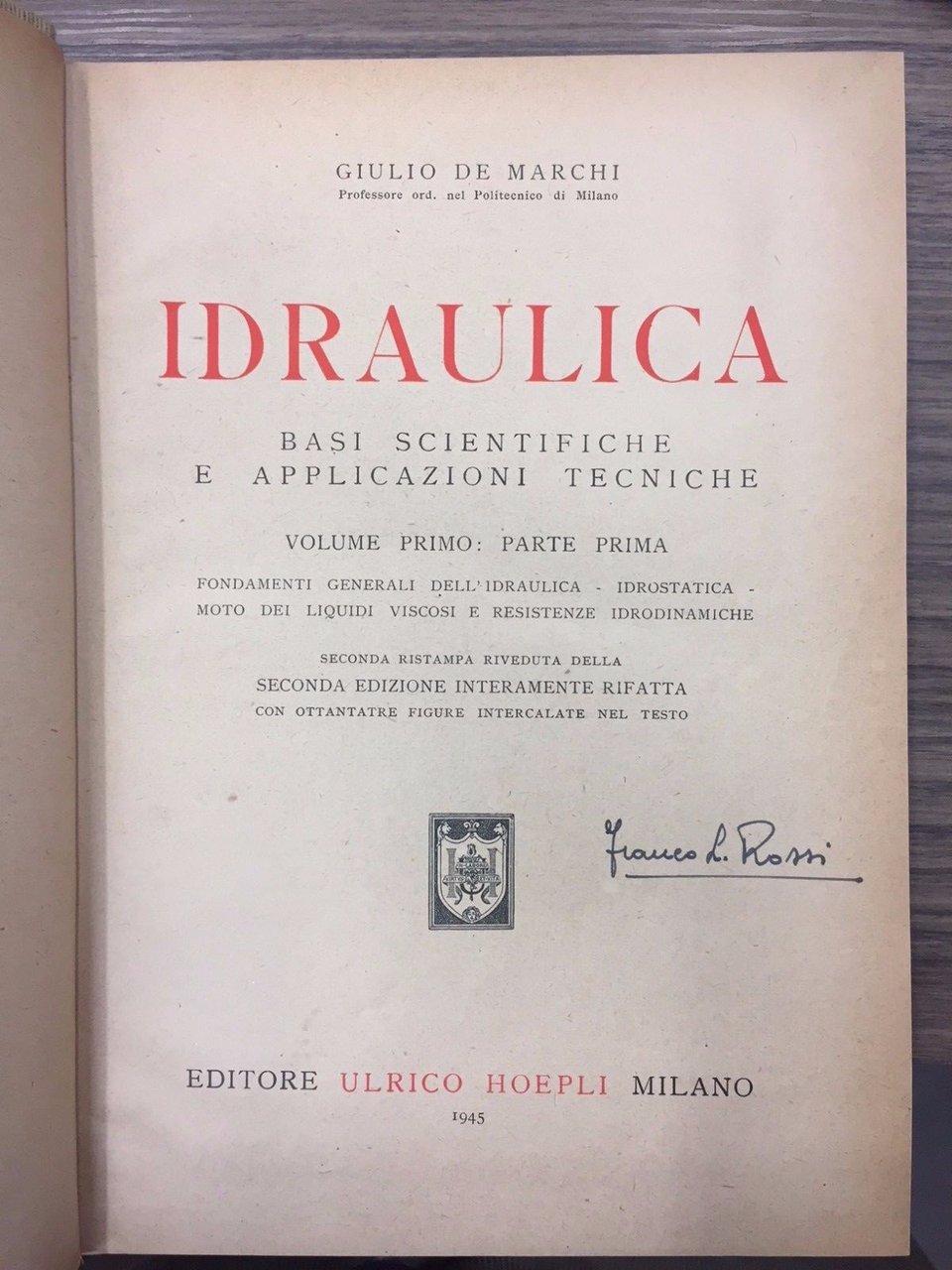 Basi scientifiche e applicazioni tecniche. Volume Primo - Parte Prima. Fondamenti generali dell'Idraulica - Idrostatica moto dei liquidi viscosi e resistenze idrodinamiche. Seconda ristampa riveduta della seconda edizione interamente rifatta con 83 figure intercalate nel testo. Milano. Hoepli 1945, 8°, pp. 372. Leg, t.t. coeva, tit. al dorso. Firma d'app.
