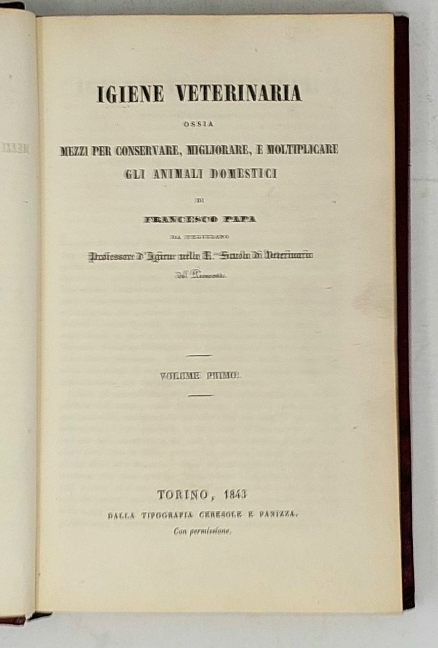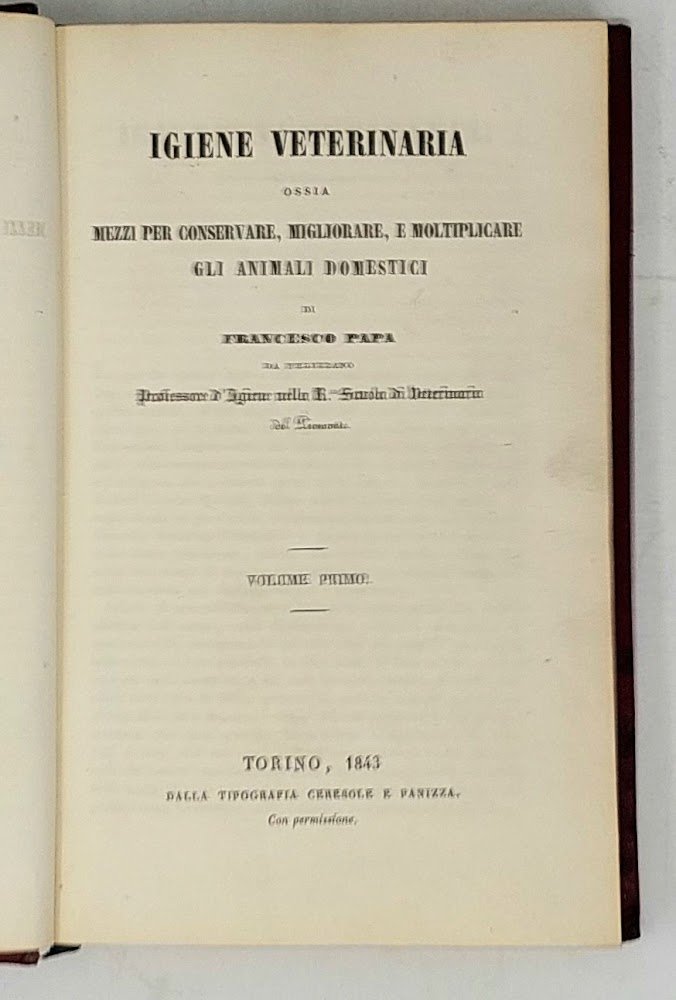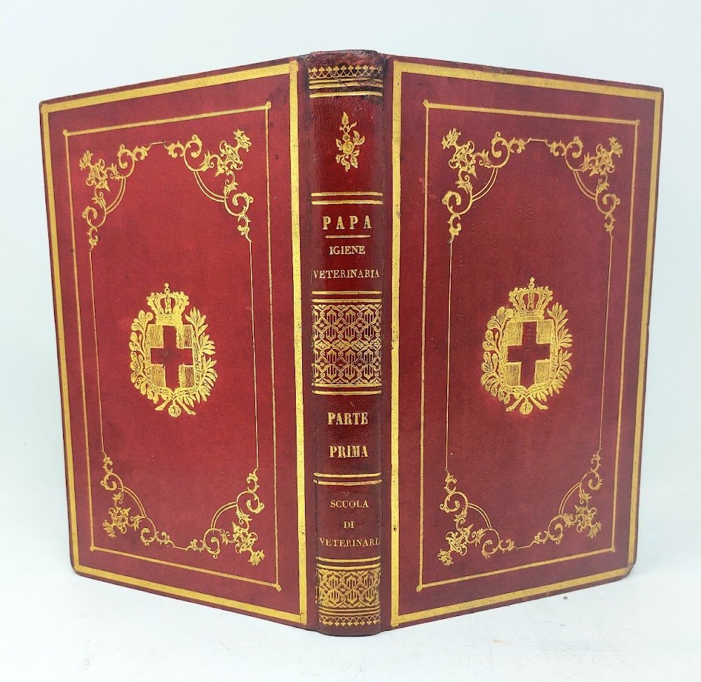 >in-8 (210x130 mm), pp. (4 di occhietto e titolo), 239, bella legatura in marocchino rosso, piatti ornati da doppia bordura di filetti e cornice con volute e motivi floreali agli angoli, al centro le armi di Casa Savoia, tutto in oro, dorso liscio con titlo filetti e minuti fregi in oro, dentelles e tagli dorati. Rara prima edizione, e forse unica, di questo trattato di zoologia e veterinaria opera di Francesco Papa, professore di Veterinaria nella Regia Suola di Veterinaria del Piemonte, nonché segretario dalla sua fondazione (1858) della "Società Nazionale di Medicina Veterinaria"e autore di numerosi trattati. L'opera, che tratta profusamente degli animali da allevamento con molti capitoli riservati ai cavalli, si annuncia come primo volume, ma non sembra esservi traccia di ulteriori volumi. Ottimo esemplare in elegante legatura sabauda.