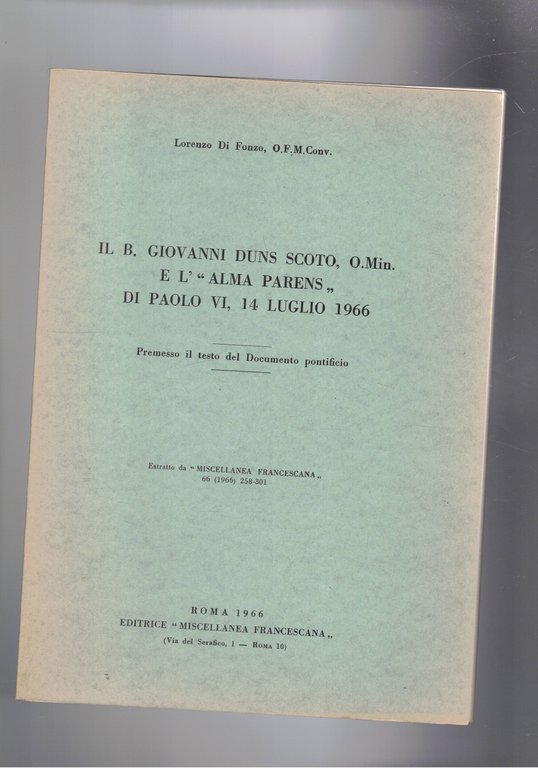Il B. Giovanni Duns Scoto, O.Min. e l'"Alma Parens" di Paolo VI, 14 luglio 1966. Premesso il testo del documento pontificio. Estratto.