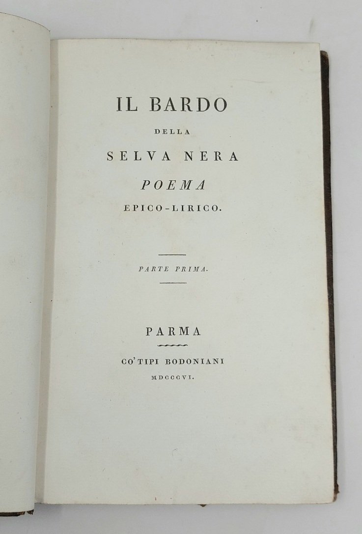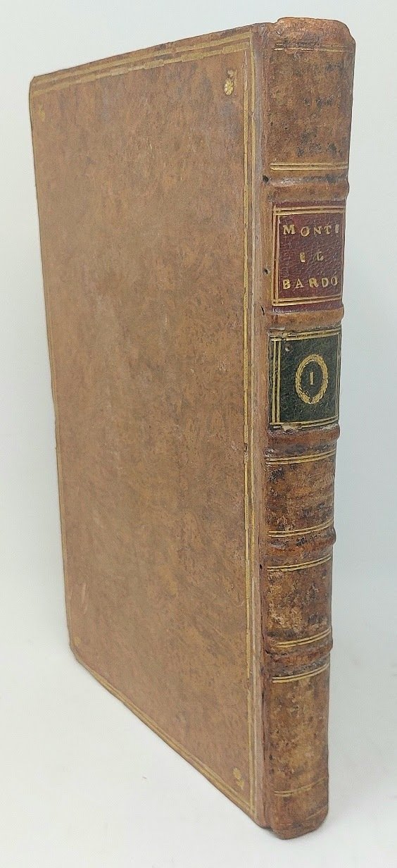 >in-8 grande (216x135 mm), pp. (4), VIII, 100, 8, (4, ultime due bianche). Legatura coeva in pelle, filetti oro e piccoli fiori angolari sui piatti, dorso a nervi con filetti e titolo in oro su tasselli (lievi restauri al dorso e alle cerniere). Prima edizione, con dedica a stampa di Monti a ''Napoleone il Grande Imperatore dei Francesi e Re d'Italia''. Prima e sola parte scritta e pubblicata del Bardo di Monti, poemetto a glorificazione di Napoleone. Ottimo esemplare della tiratura in-ottavo su carta forte (esiste anche in-quarto e in-folio). Brooks, 999. Bustico n.230. Gamba n.2622. Parenti, 354.