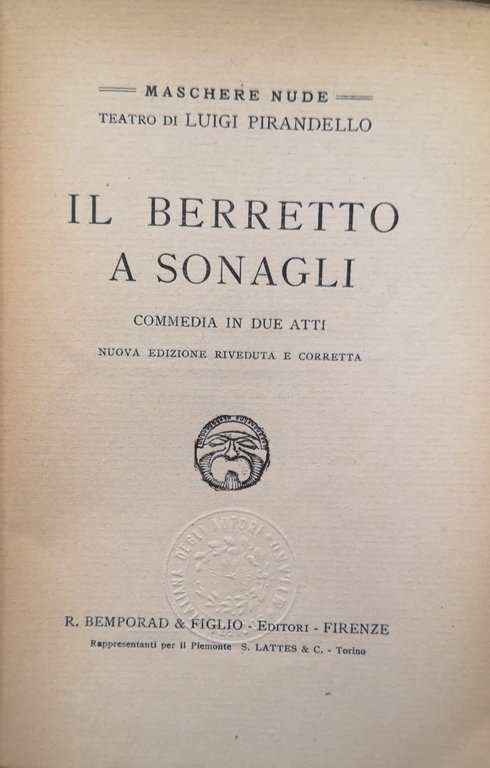 IL BERRETTO A SONAGLI. COMMEDIA IN DUE ATTI. - Fa parte di Maschere Nude, teatro di Luigi Pirandello, volume n. 14.