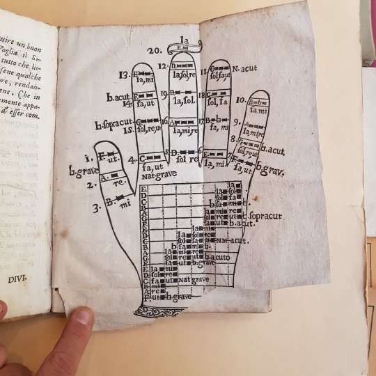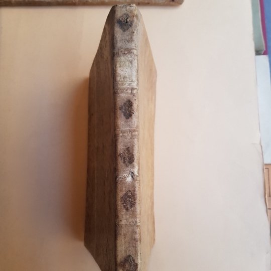 In 4° (22x16,5 cm), pp.164, (8), una tavola fuori testo in xilografia in antiporta raffigurante un leggio con il corale affiancato da due cherubini ed una tavola f.t. con la mano musicale guidoniana. Legatura in piena pergamena dell'epoca mancante al dorso del tassello del titolo. Buon esemplare. Mancanza di una parte inferiore della tavola fuori testo con piccola lacuna alla xilografia.