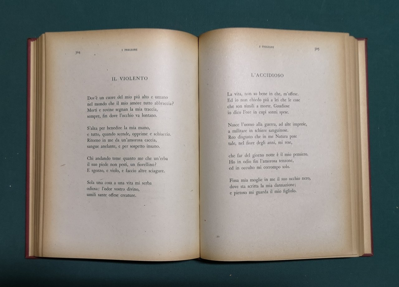 >in-8, pp. (4), 610, (2), legatura in tela, titolo in oro su tassello al dorso. Edizione in parte originale, progettata dal poeta stesso. Molti componimenti compaiono qui per la prima volta. Gambetti-Vezzosi, Rarità bibliografiche del Novecento italiano, pp. 793-94: “Edizione di qualità modesta per le difficoltà della guerra [...] Molto ricercata”. Buon esemplare.