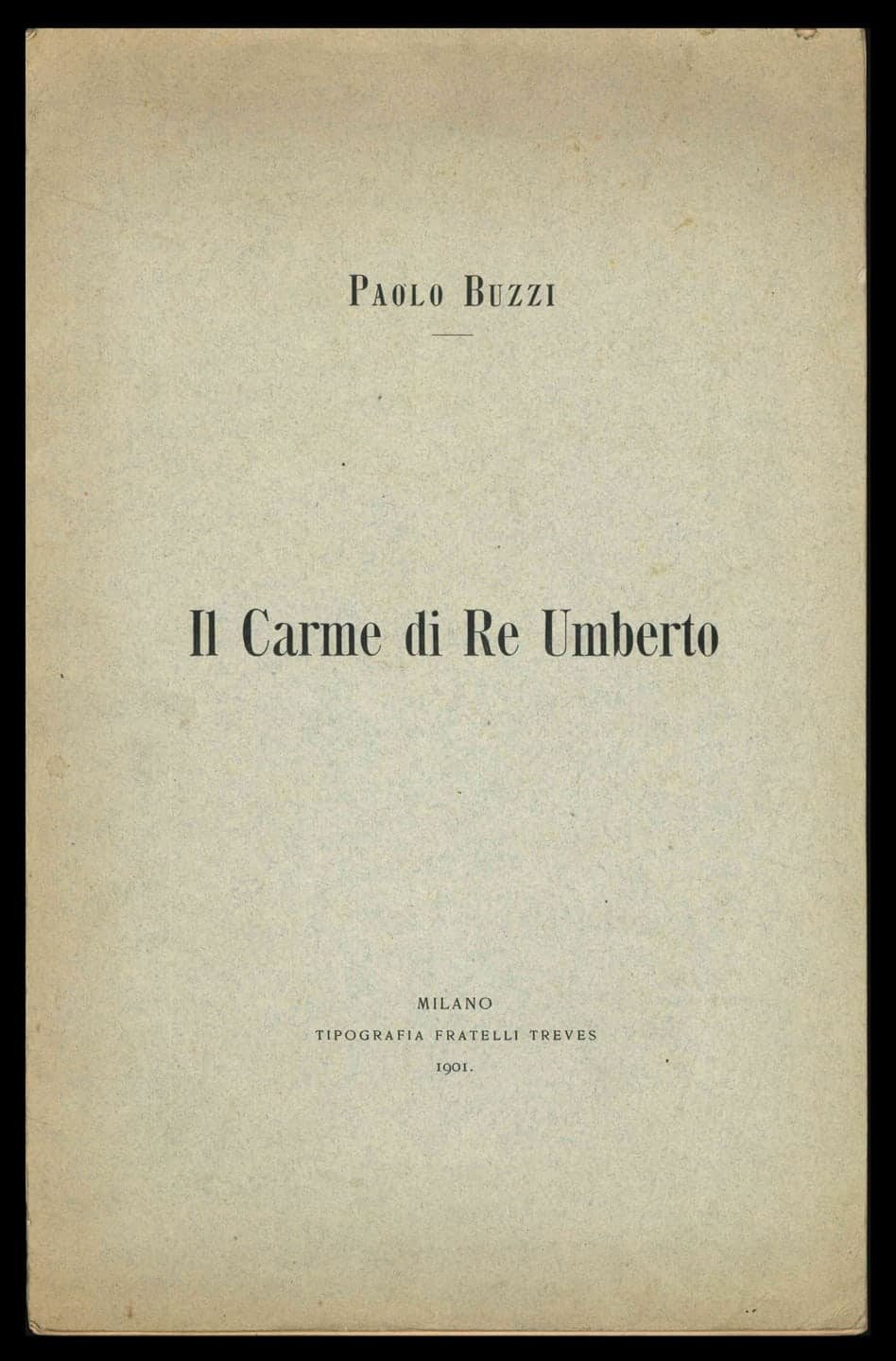 LIBROEdizione originale.Più che buon esemplare, quasi ottimo, nella brossura originale.«Parte dell’opera Carmen Sæculare in composizione», dedicato «A Sua Maestà la Regina Margherita» nel primo anniversario della morte del Re, datato in piè dell’ultima pagina «Milano, 29 Luglio 1901». Assieme al «Il Carme di Napoleone Bonaparte» (P. Agnelli 1901) e al successivo «La Notte di Roma» (Libreria Editrice Internazionale 1903), questo opuscolo è una delle rare testimonianze a stampa del progetto noto come «Carmen sæculare» che Buzzi andò elaborando dalla fine dell’800 per consegnarlo alle stampe solo nel 1919-20 come «Poema di Garibaldi» e «Carmi degli Augusti e dei Consolari». Il presente carme, tuttavia, fu poi escluso dalla raccolta e risulta non altrimenti edito.Rampazzo, «Paolo Buzzi tra Gabriele D’Annunzio e Giuseppe Garibaldi» («Riv. Lett. Ital.» XXVII.3, 2009), p. 206 nota 9 ; Buzzi, «Futurismo scritti carteggi.», p. 8: «[.] Emilio Treves il quale mi pubblicava un Carme di Re Umberto e, più tardi, benedetto lui! i Versi Liberi»