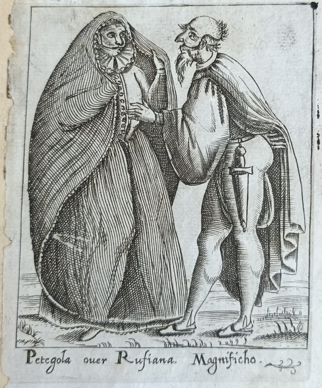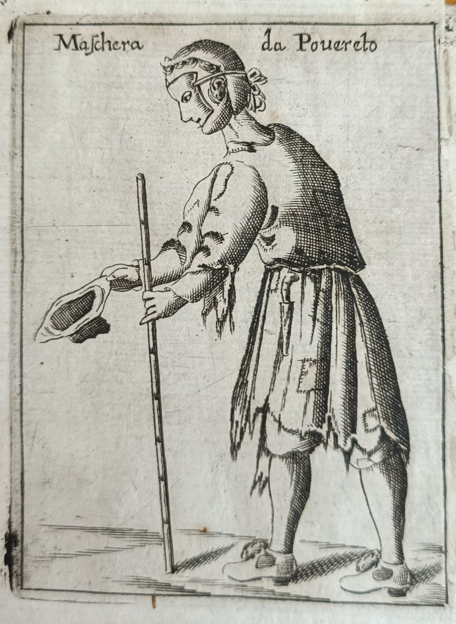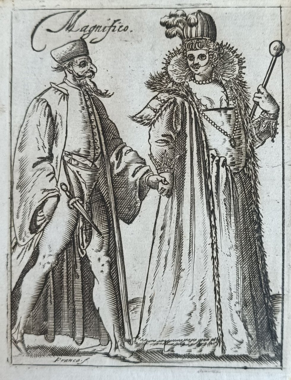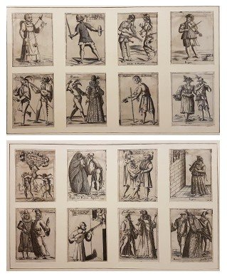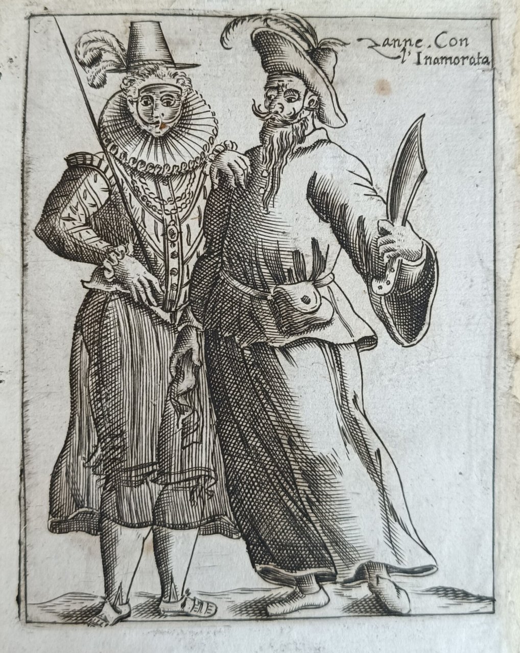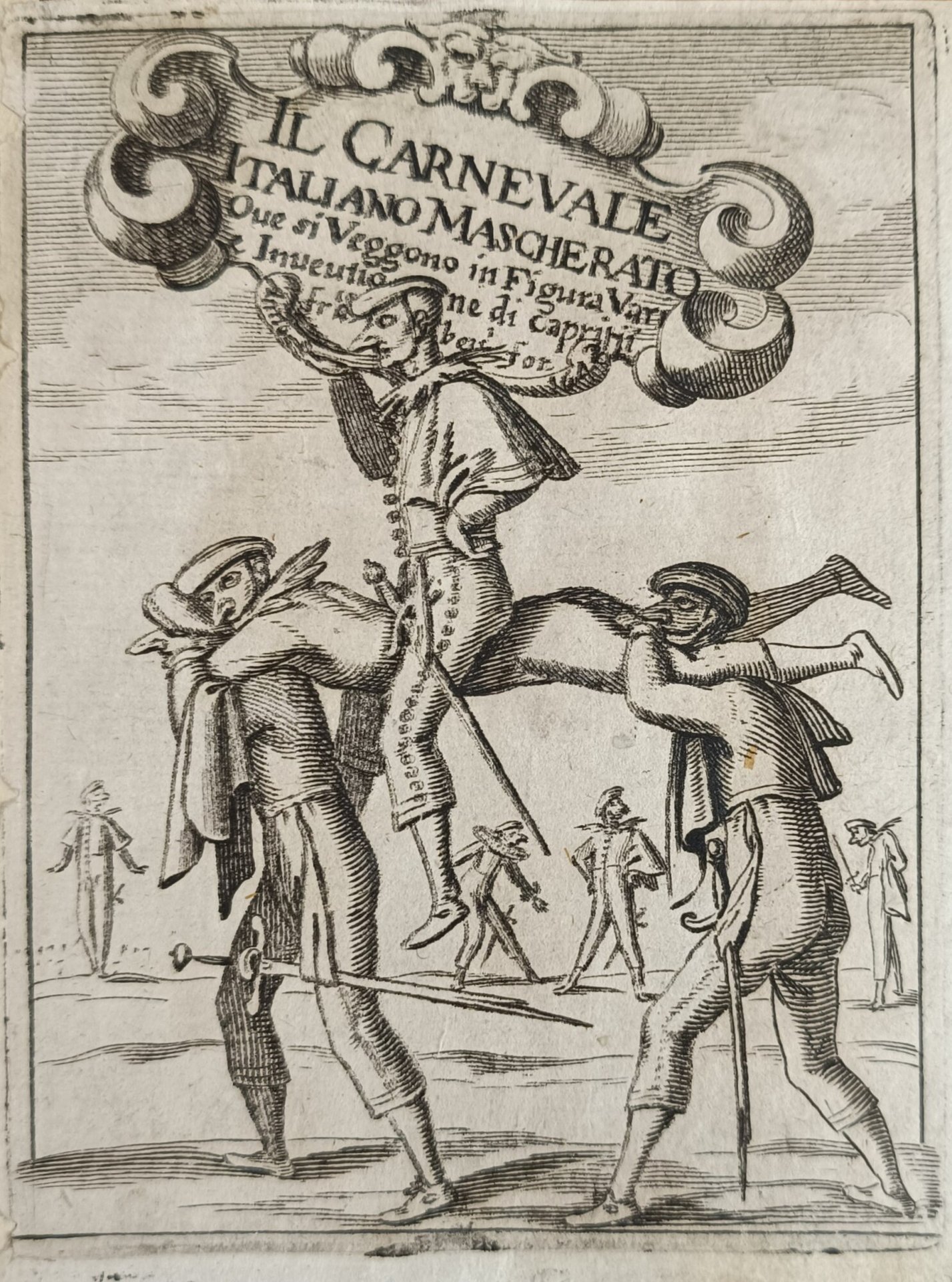 E' il primo repertorio iconografico esclusivamente dedicato al tema del carnevale veneziano. Si tratta di una serie di incisioni pubblicate nel 1642 da Francesco Bertelli, tipografo editore ed incisore padovano. La raccolta completa è quasi introvabile (un volume originale del British Museum ne riporta ventisei, mentre al Museo Correr di Venezia sono conservati 28 fogli sparsi). Vengono qui presentate 16 incisioni. Per approfondimenti: http://leparolediminerva.blogspot.it/2016/12/anche-natale-e-carnevale.html acquaforte cm. 11 x 9 ca. Buono (Good) Buon es., alcune rifilate.