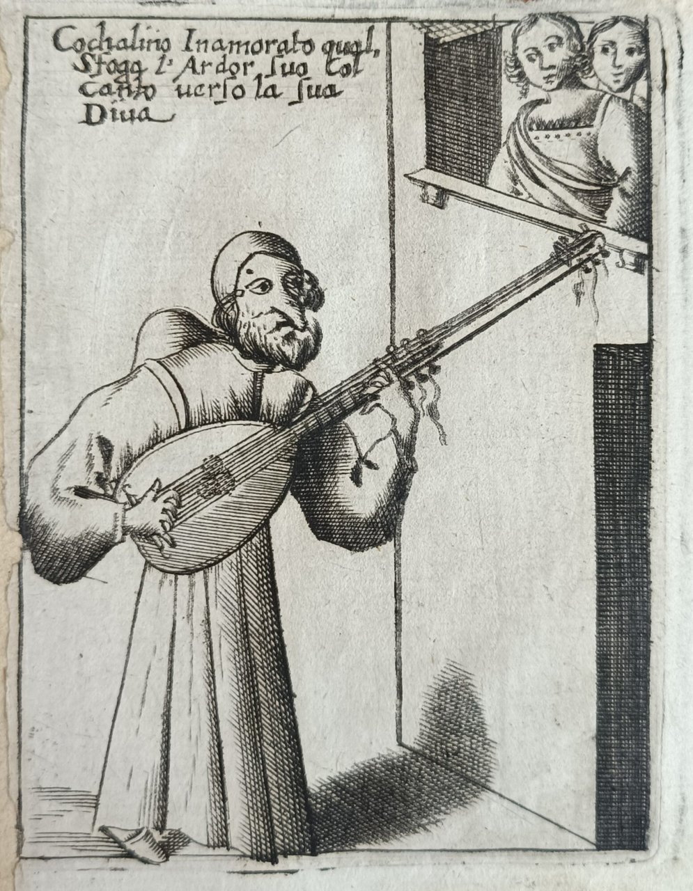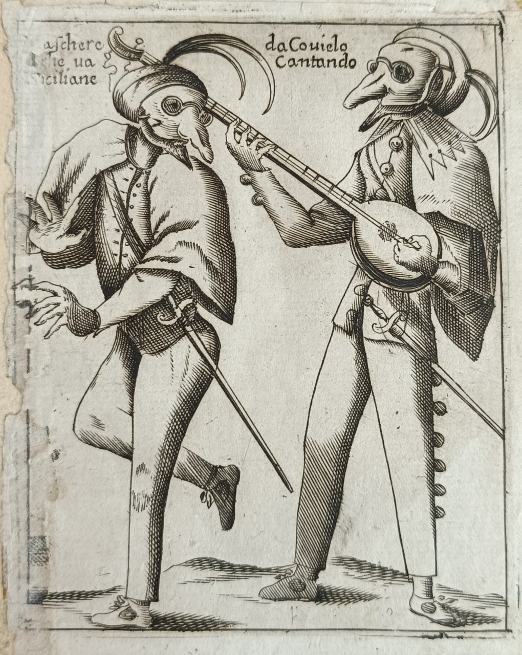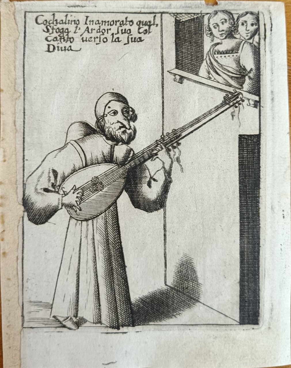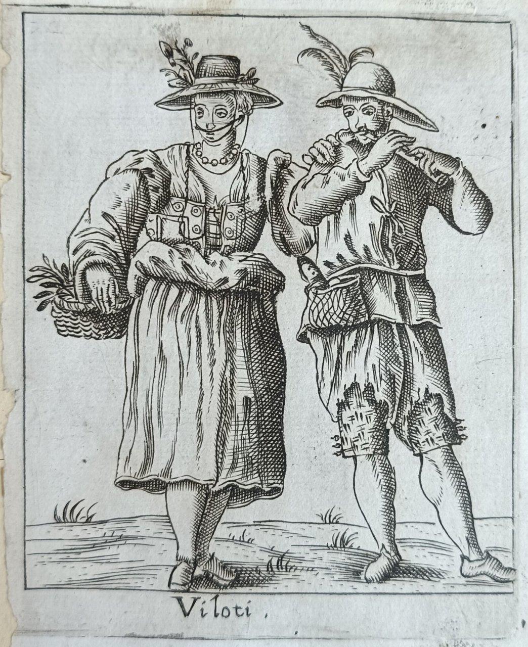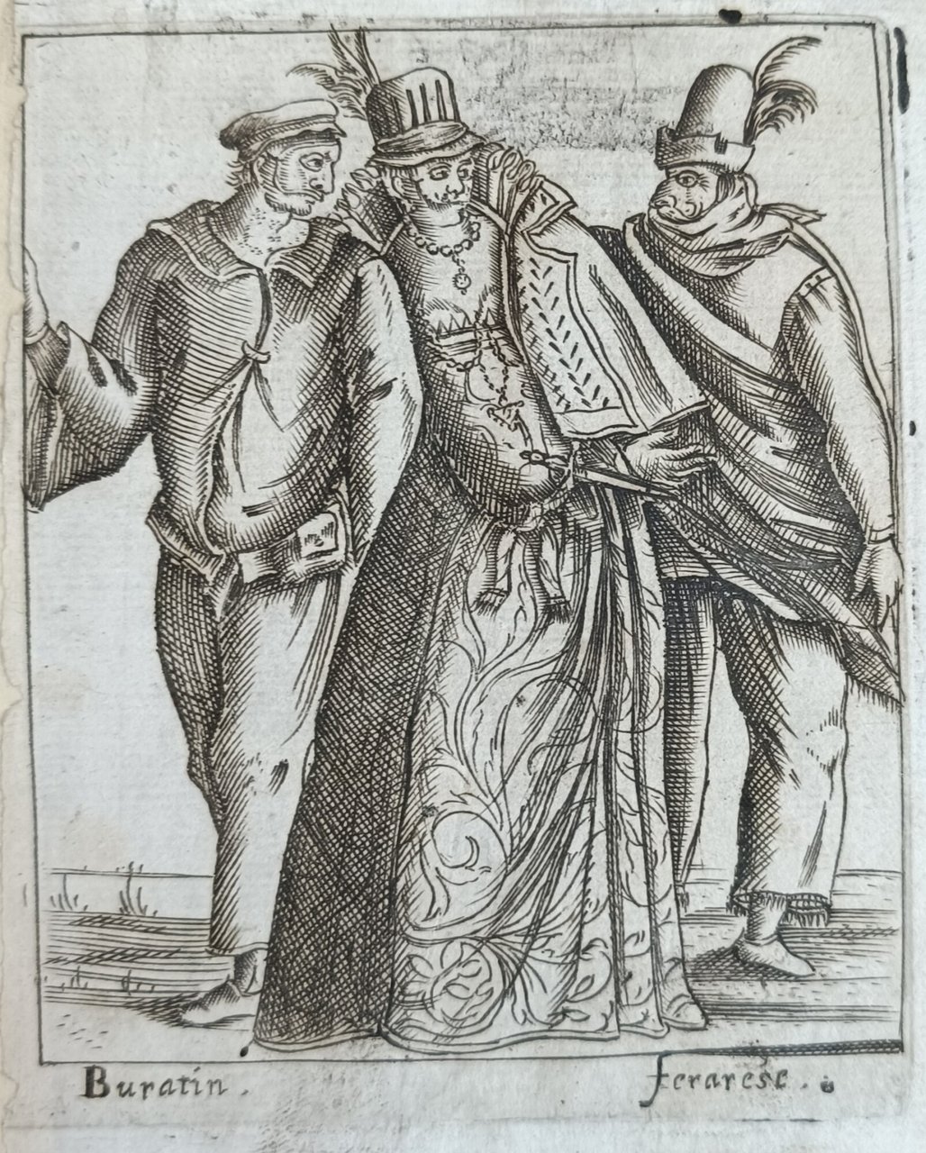 E' il primo repertorio iconografico esclusivamente dedicato al tema del carnevale veneziano. Si tratta di una serie di incisioni pubblicate nel 1642 da Francesco Bertelli, tipografo editore ed incisore padovano. La raccolta completa è quasi introvabile (un volume originale del British Museum ne riporta ventisei, mentre al Museo Correr di Venezia sono conservati 28 fogli sparsi). Vengono qui presentate 16 incisioni. Per approfondimenti: http://leparolediminerva.blogspot.it/2016/12/anche-natale-e-carnevale.html acquaforte cm. 11 x 9 ca. Buono (Good) Buon es., alcune rifilate.