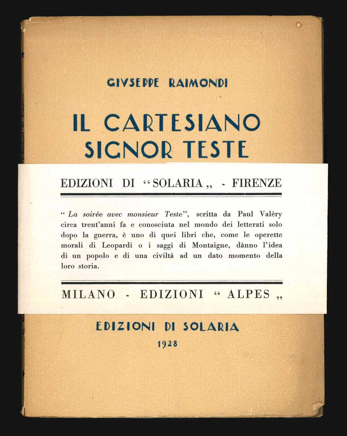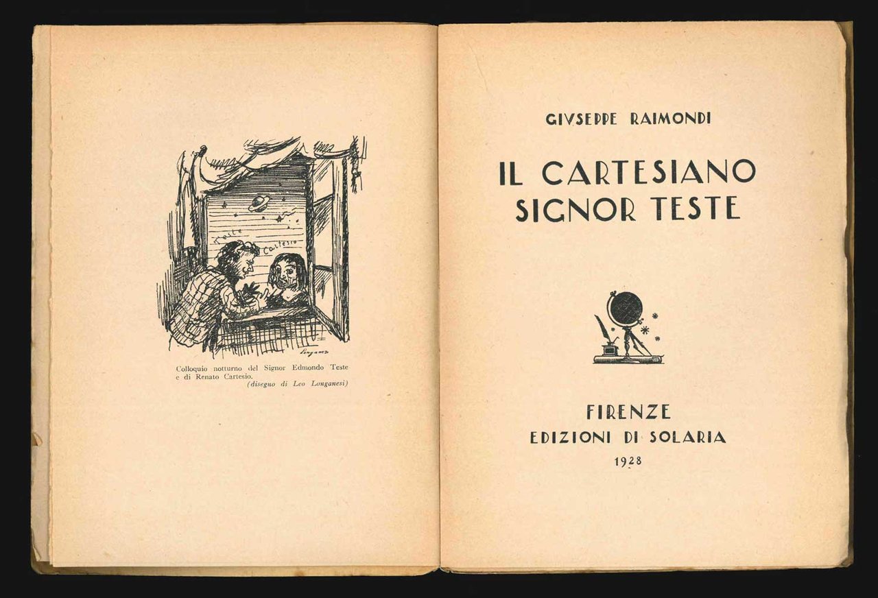 LIBROEdizione originale.Eccezionale esemplare: la copia numero 101 di 420, che conserva ancora una rarissima e curiosa fascetta editoriale: «EDIZIONI DI “SOLARIA” - FIRENZE — “La soirée avec monsieur Teste”, scritta da Paul Valèry circa trent’anni fa e conosciuta nel mondo dei letterati solo dopo la guerra, è uno di quei libri che, come le operette morali di Leopardi o i saggi di Montaigne, dànno l’idea di un popolo e di una civiltà ad un dato momento della loro storia. — MILANO - EDIZIONI “ALPES”».Brillante operetta a metà tra il saggio e l’esercizio letterario, dedicata al Valéry di «La soirée avec monsieur Teste». Inusualmente per le edizioni di «Solaria», la copertina presenta un design a due colori impreziosito da una piccola illustrazione, non firmata ma di Bruno Bramanti, che parve non gradita all’autore — da cui l’esistenza di copie con la classica grafica di copertina «Solaria». Fu Raimondi, naturalmente, a volere il disegno di Leo Longanesi stampato in antiporta e raffigurante il «Colloquio notturno del Signor Edmondo Teste e di Renato Cartesio».